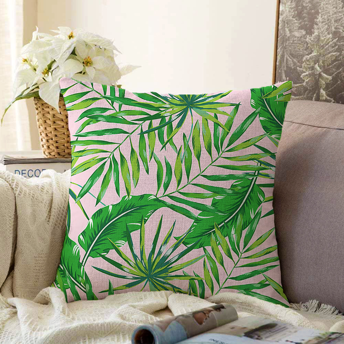 Renkli Zemin Üzerinde Yaprak Desenli Dijital Baskılı Modern Raşel Kadife Yastık Kırlent Kılıfı