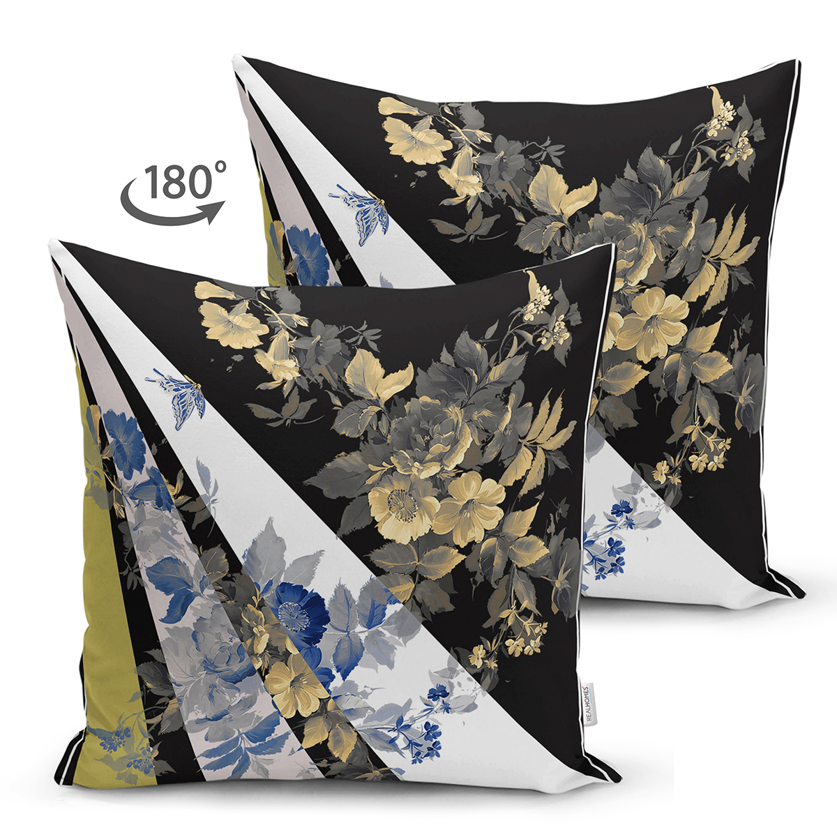 Çift Taraflı Siyah Beyaz Zeminde Çiçek Motifli Özel Tasarım Dijital Baskılı Modern Süet Yastık Kırlent Kılıfı