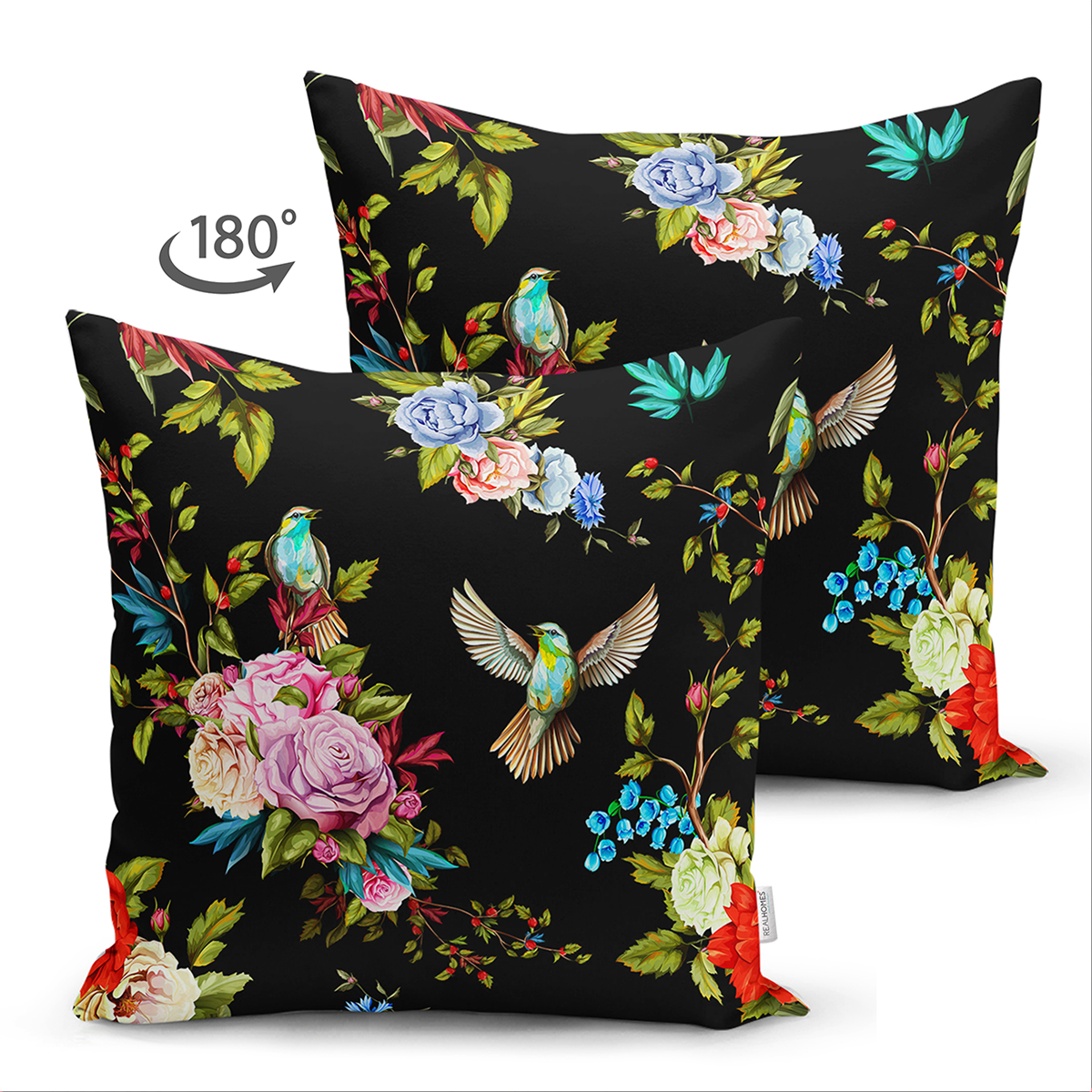 Çift Taraflı Siyah Zemin Üzerinde Çiçek Desenli Kuş Figurlu Modern Süet Yastık Kırlent Kılıfı Realhomes