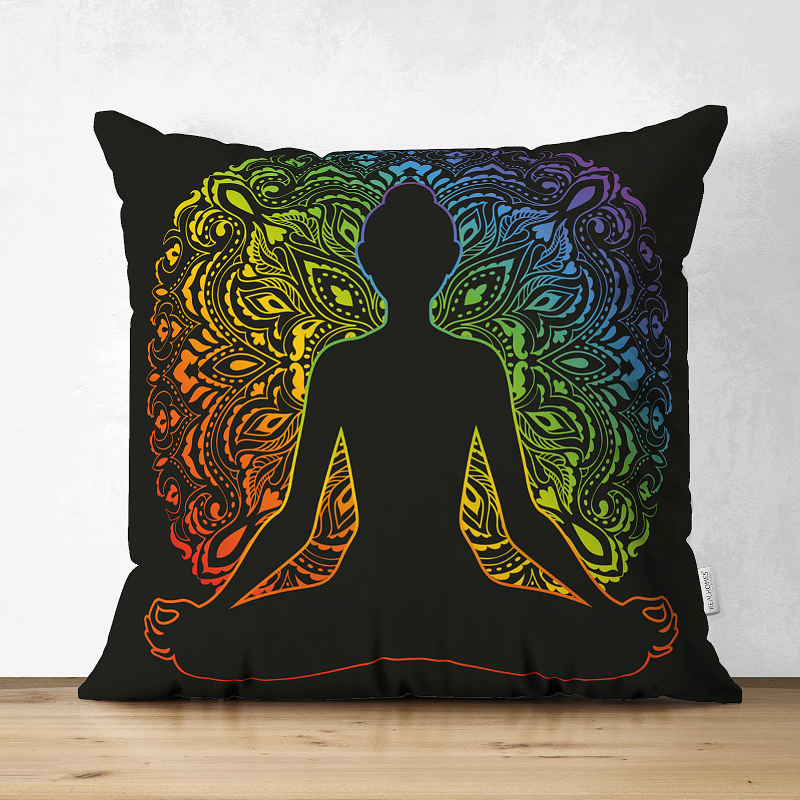 Çift Taraflı Siyah Zeminde Gökkuşağı Motifli Uzak Doğu Yoga Desenli Süet Kırlent Kılıfı Realhomes