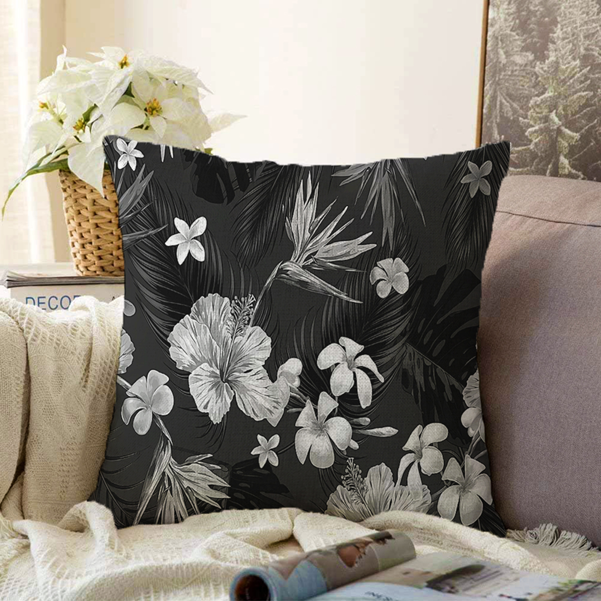 Siyah Zeminli Beyaz Çiçek Desenli Dijital Baskılı Modern Raşel Kadife Yastık Kırlent Kılıfı