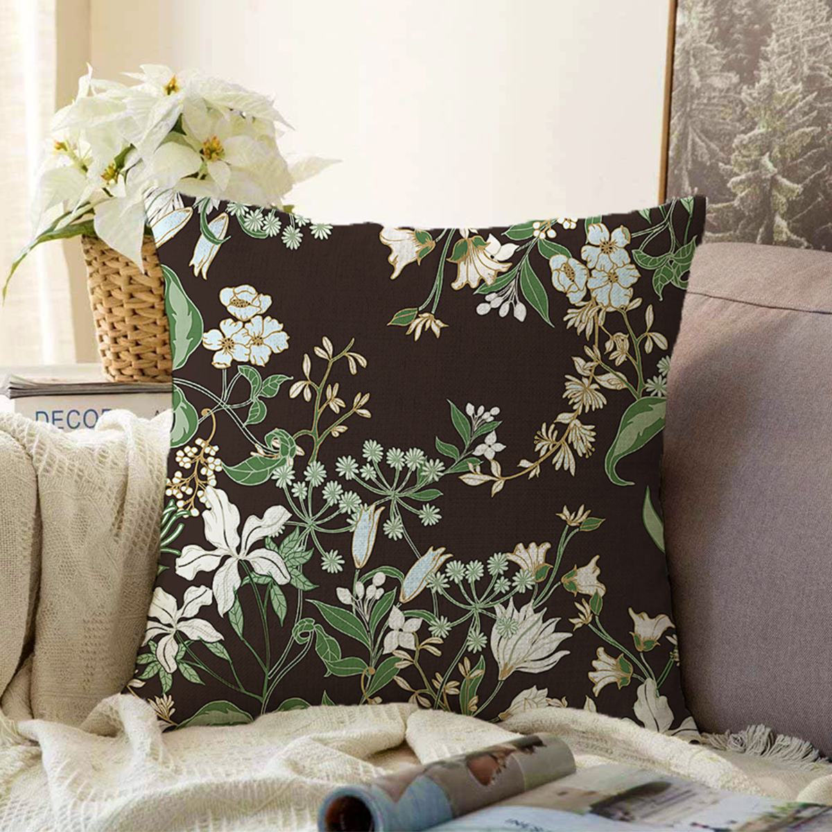 Siyah Zeminli Beyaz Çiçek Desenli Dijital Baskılı Modern Raşel Kadife Yastık Kırlent Kılıfı