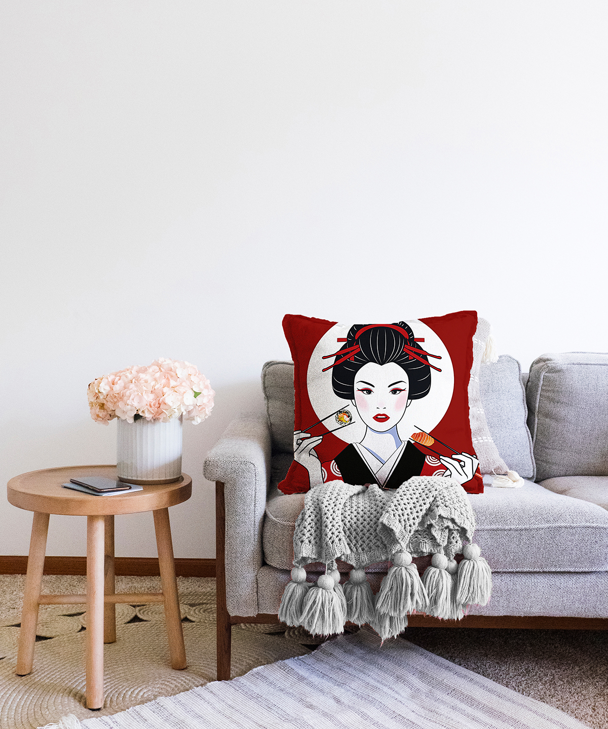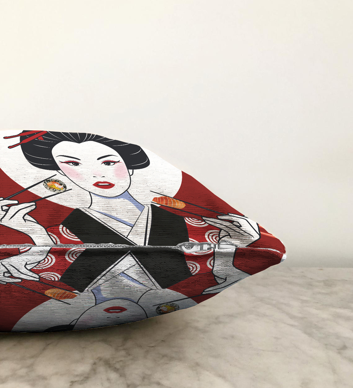 Suşi Yiyen Japon Kız Motifli Modern Raşel Kadife Yastık Kılıfı