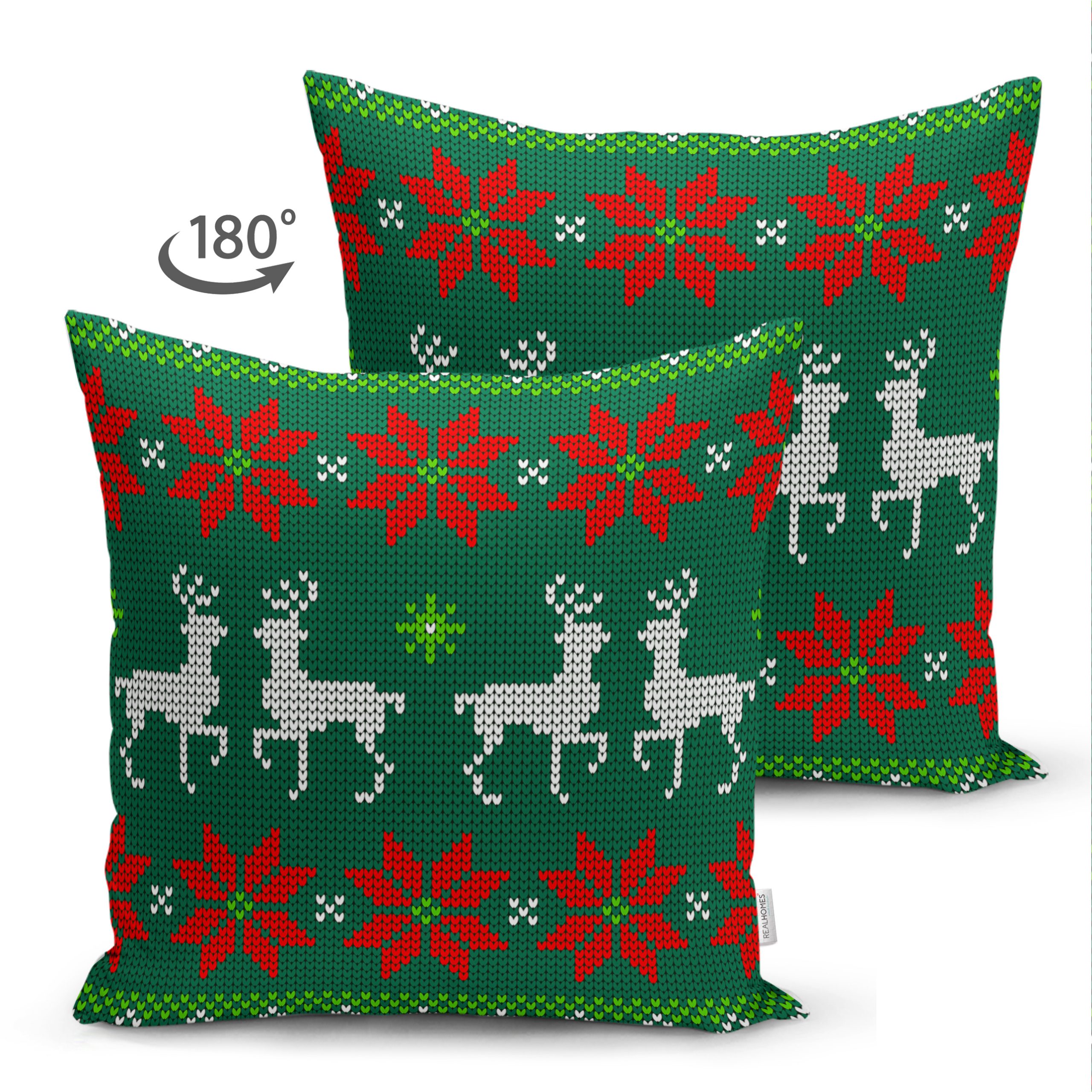 Çift Taraflı Yeşil Zeminde Yılbaşı Geyikleri Desenli Dekoratif Süet Yastık Kırlent Kılıfı Realhomes