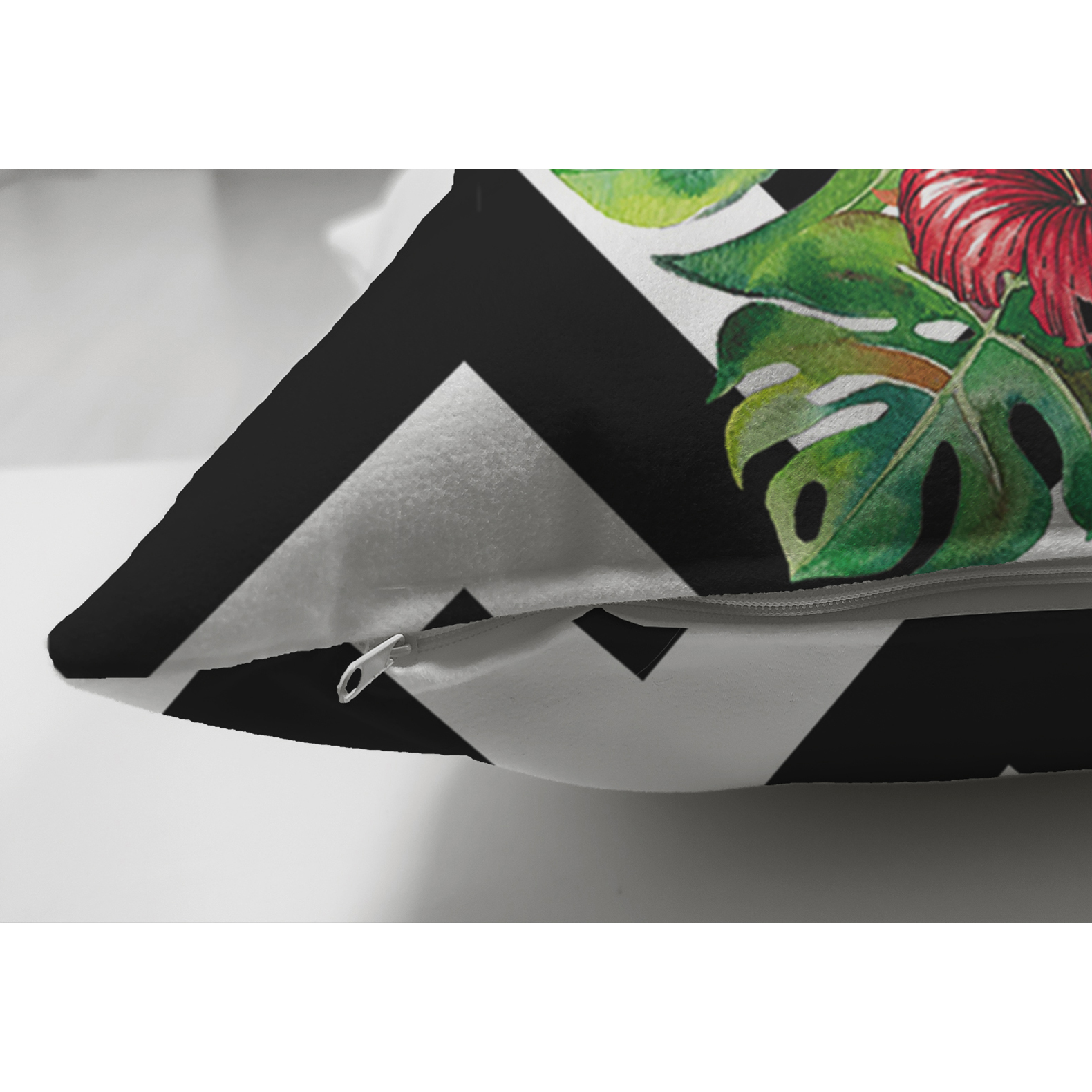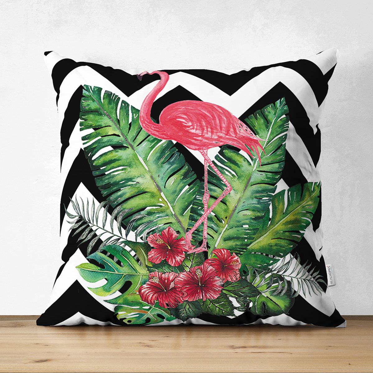 Çift Taraflı Zigzag Zeminde Flamingo ve Yapraklar Tasarımlı Modern Süet Yastık Kırlent Kılıfı Realhomes