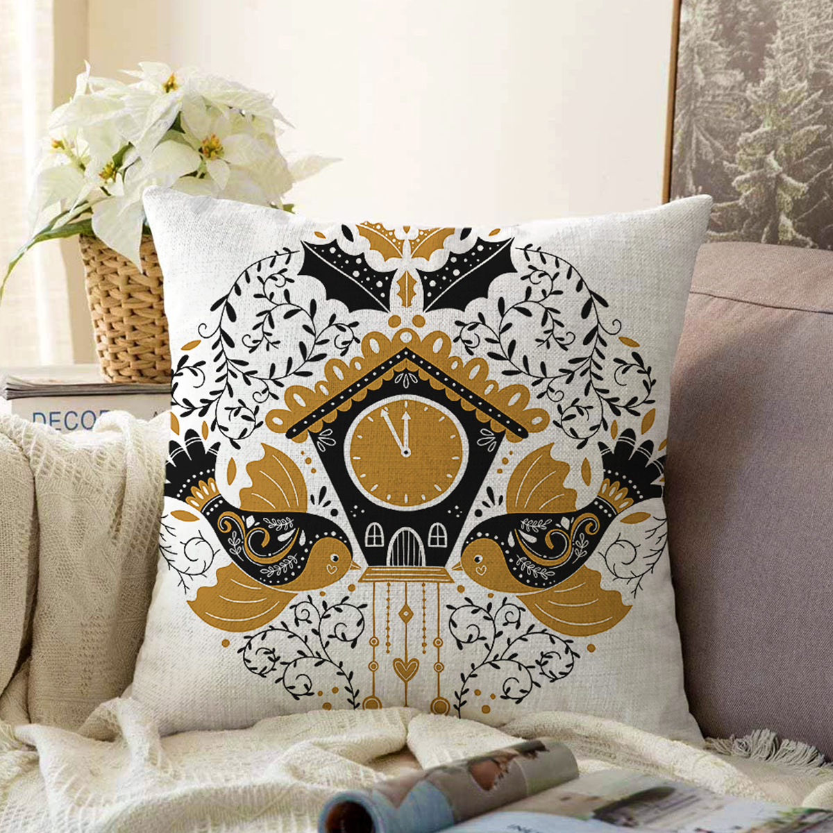 Çini Çizimli Guguklu Saat Motifli Dijital Baskılı Dekoratif Raşel Kadife Yastık Kırlent Kılıfı