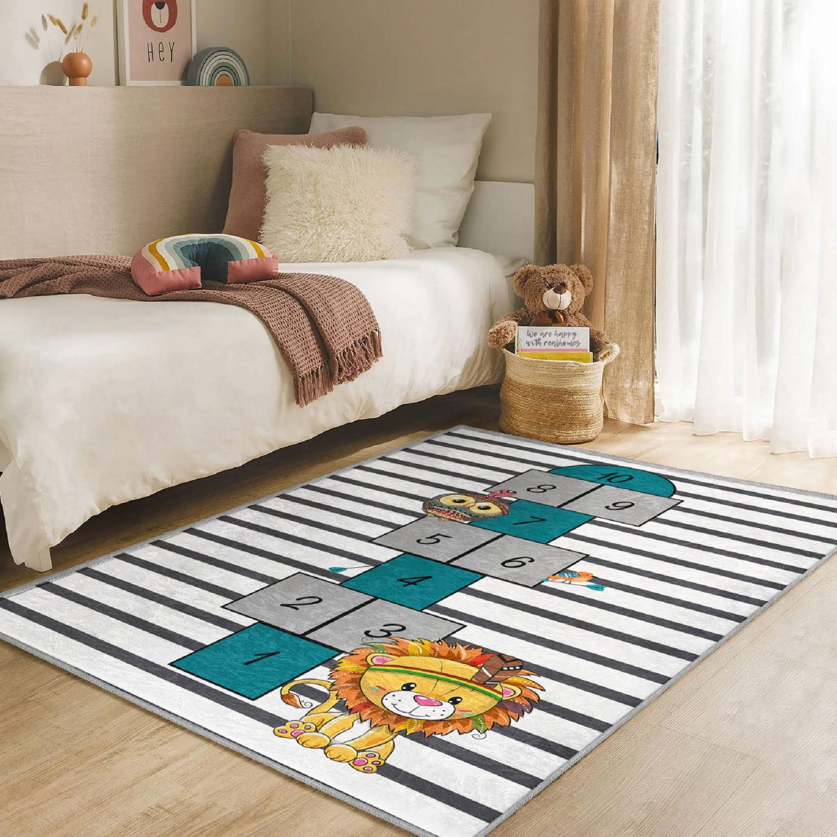 Çizgili Zemin Aslan Kuşlar Seksek Tasarımlı Çocuk & Genç Odası Makinede Yıkanabilir Kaymaz Tabanlı Dikdörtgen Çocuk Oyun Halısı