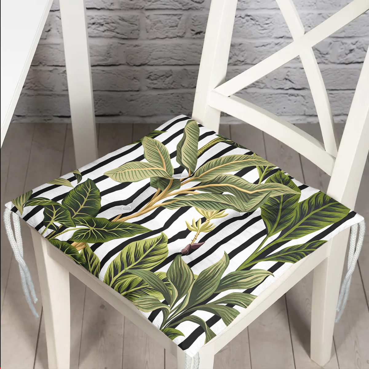 Çizgili Zemin Tropik Yaprak Motifli Modern Pofuduk Sandalye Minderi