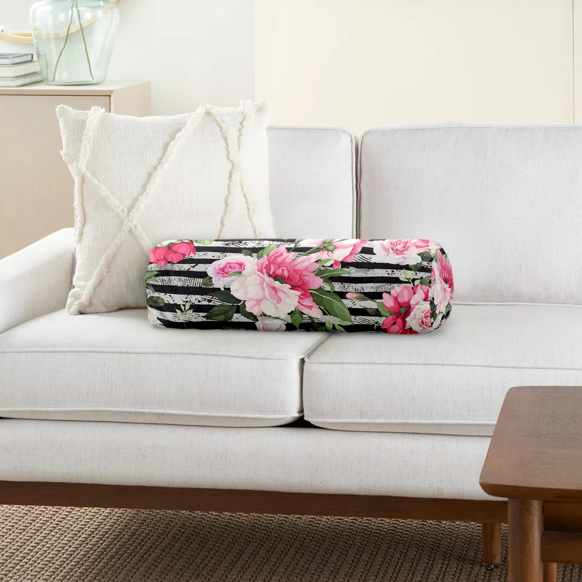 Çizgili Zeminde Rengarenk Çiçekler Dijital Baskılı Modern İç Dolgulu – Fermuarlı Süet Silindir Daire Yastık Kırlent