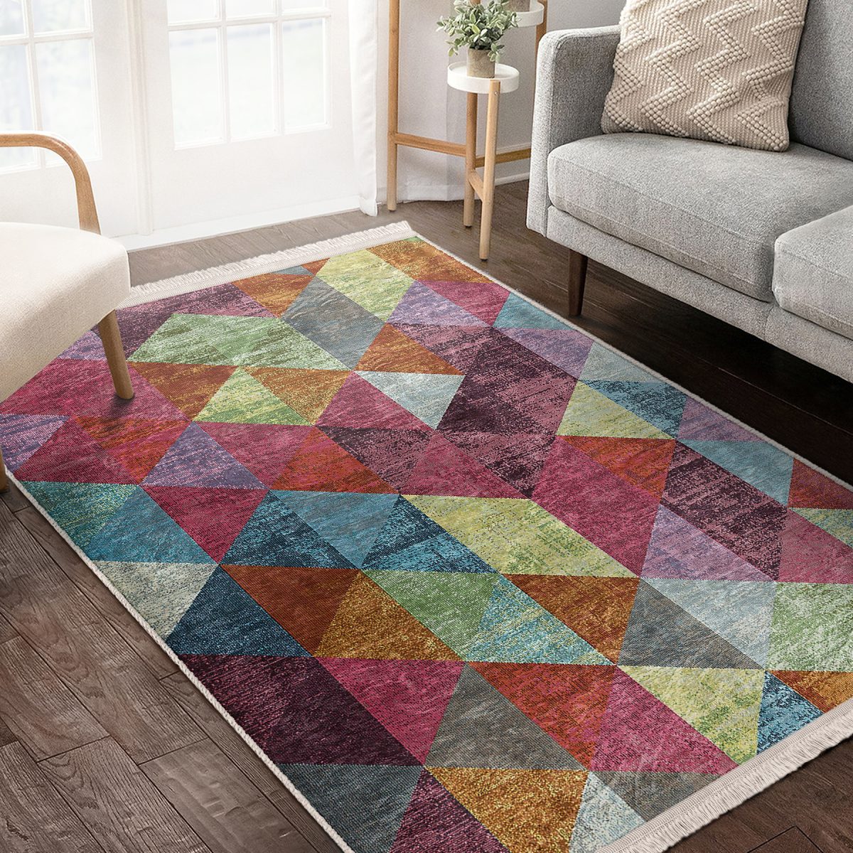 Çok Renkli Zeminde El Dokuma Motifli Üçgen Desenli Geometrik Sade & Şık Koridor & Antre Çocuk & Genç Odası Dijital Baskılı Makinede Yıkanabilir Kaymaz Taban Saçaklı Halı