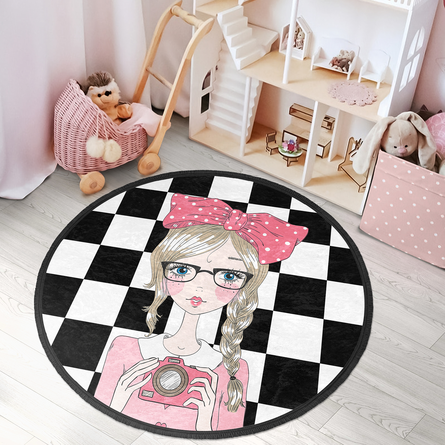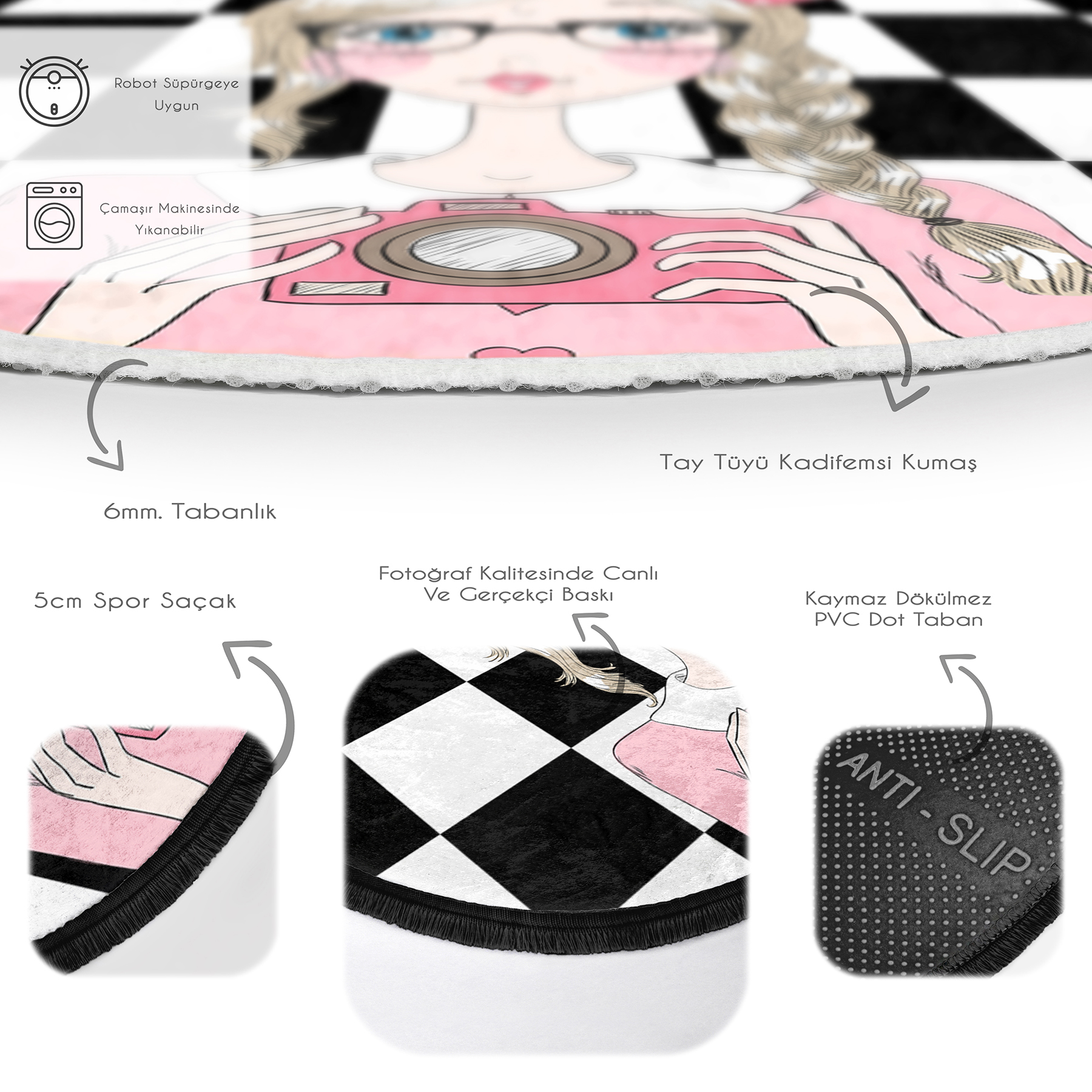 Dama Zeminli Fotoğraf Çeken Kız Tasarımlı Çocuk & Genç Odası Makinede Yıkanabilir Kaymaz Tabanlı Püsküllü Yuvarlak Çocuk Halısı