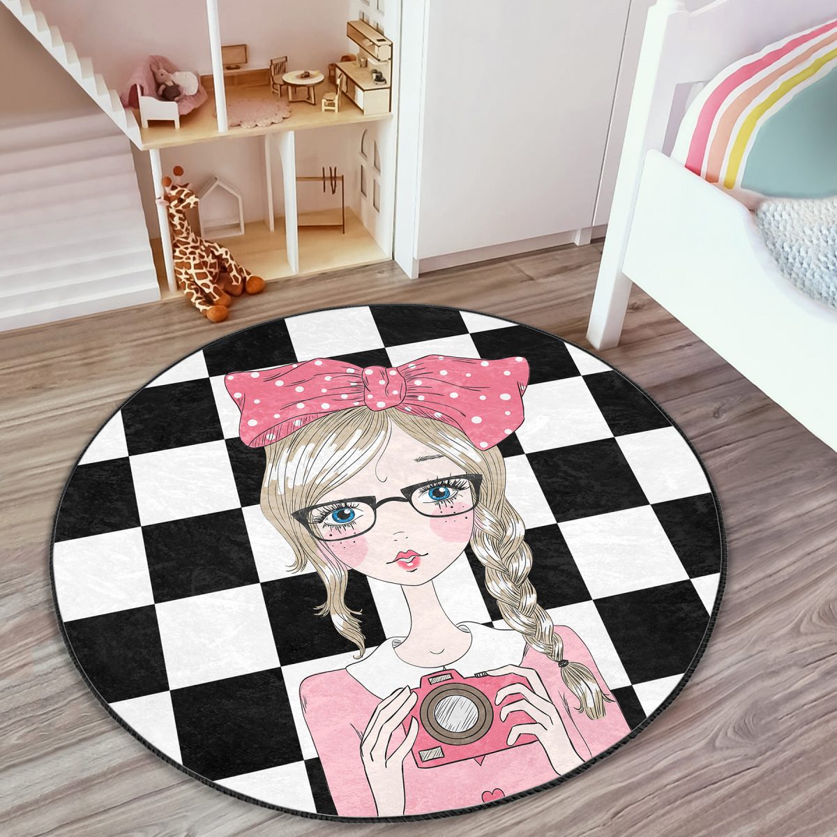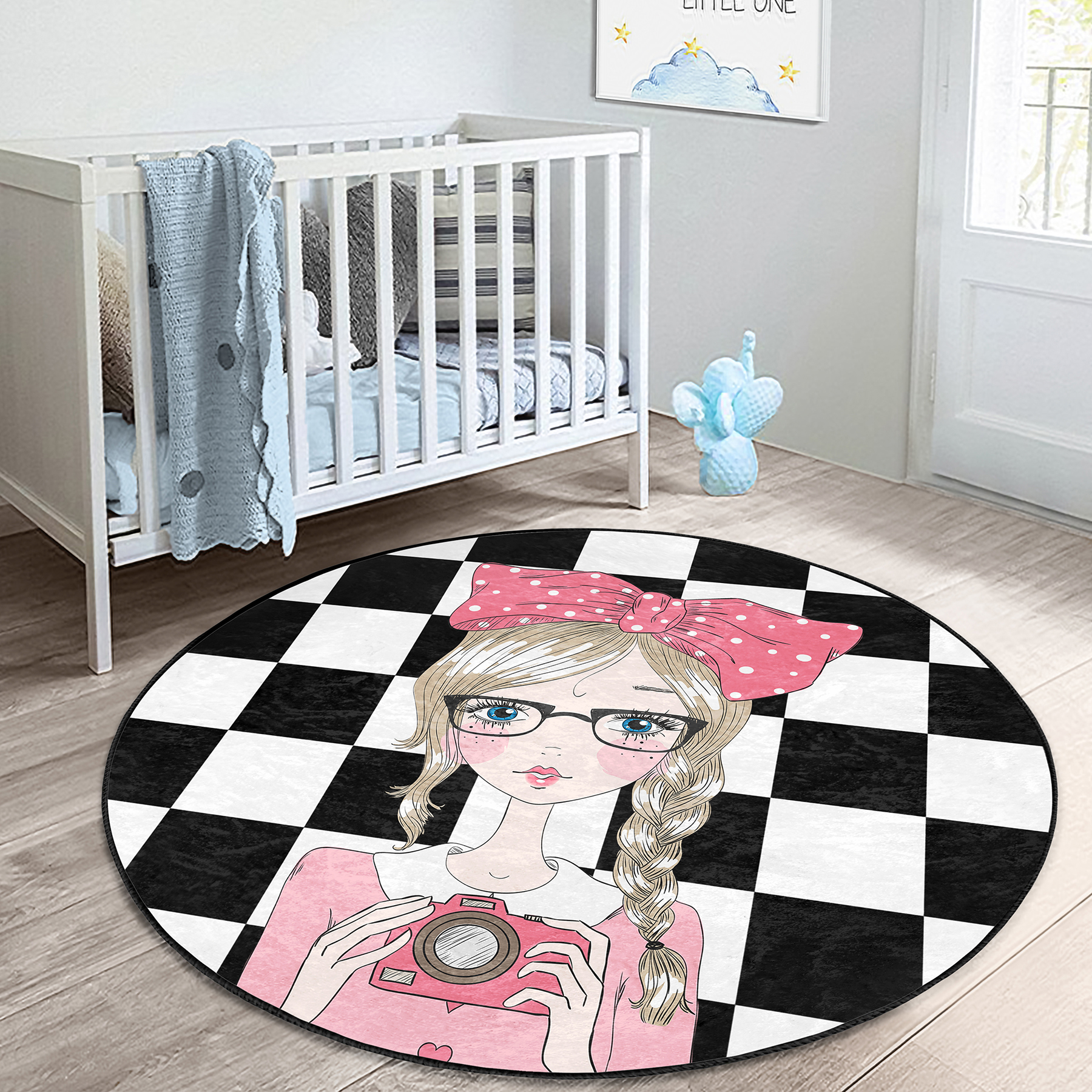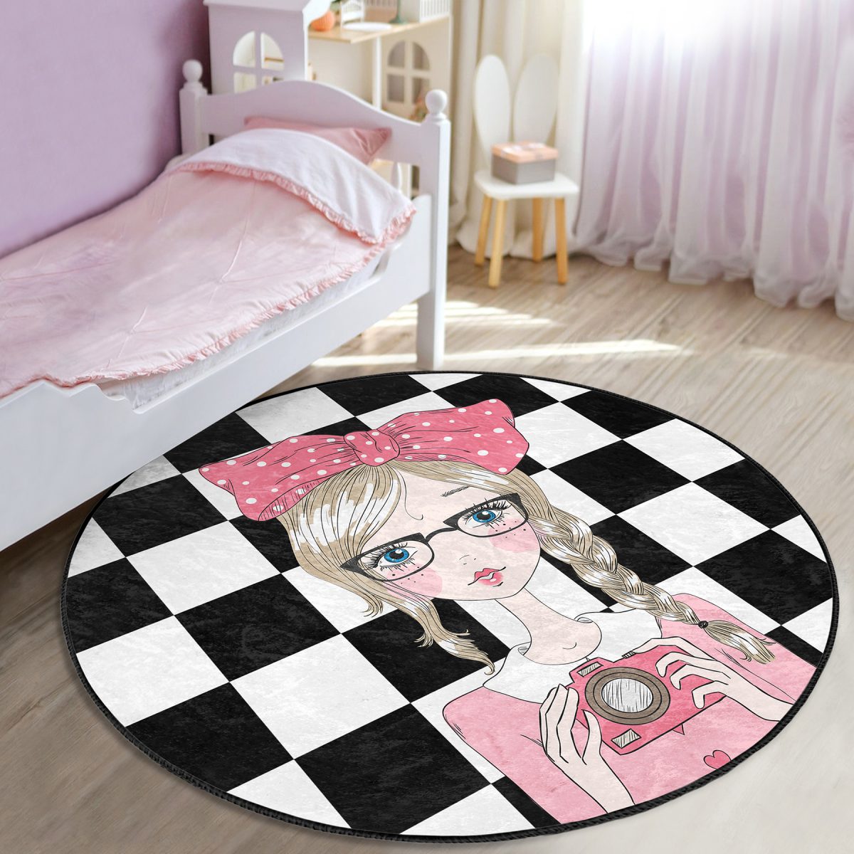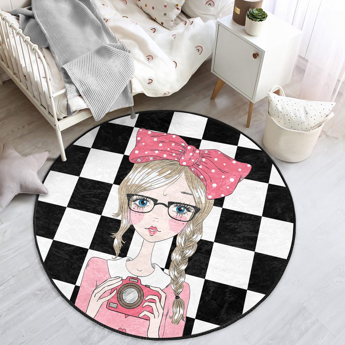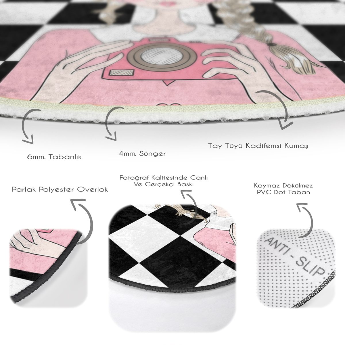 Dama Zeminli Fotoğraf Çeken Kız Tasarımlı Çocuk & Genç Odası Makinede Yıkanabilir Kaymaz Tabanlı Yuvarlak Çocuk Halısı