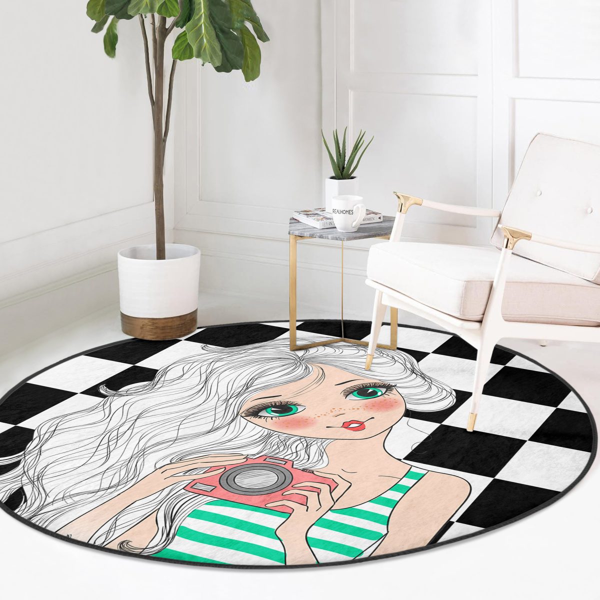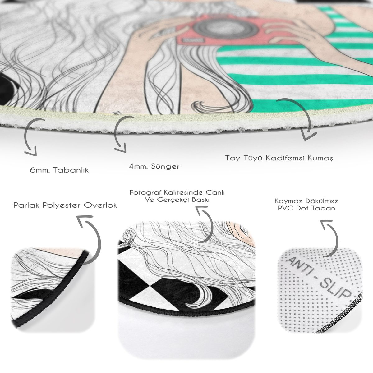 Dama Zeminli Fotoğraf Çeken Kız Tasarımlı Dijital Baskılı Modern Yeşil Çocuk ve Genç Odası Yıkanabilir Kaymaz Tabanlı Yuvarlak Halı