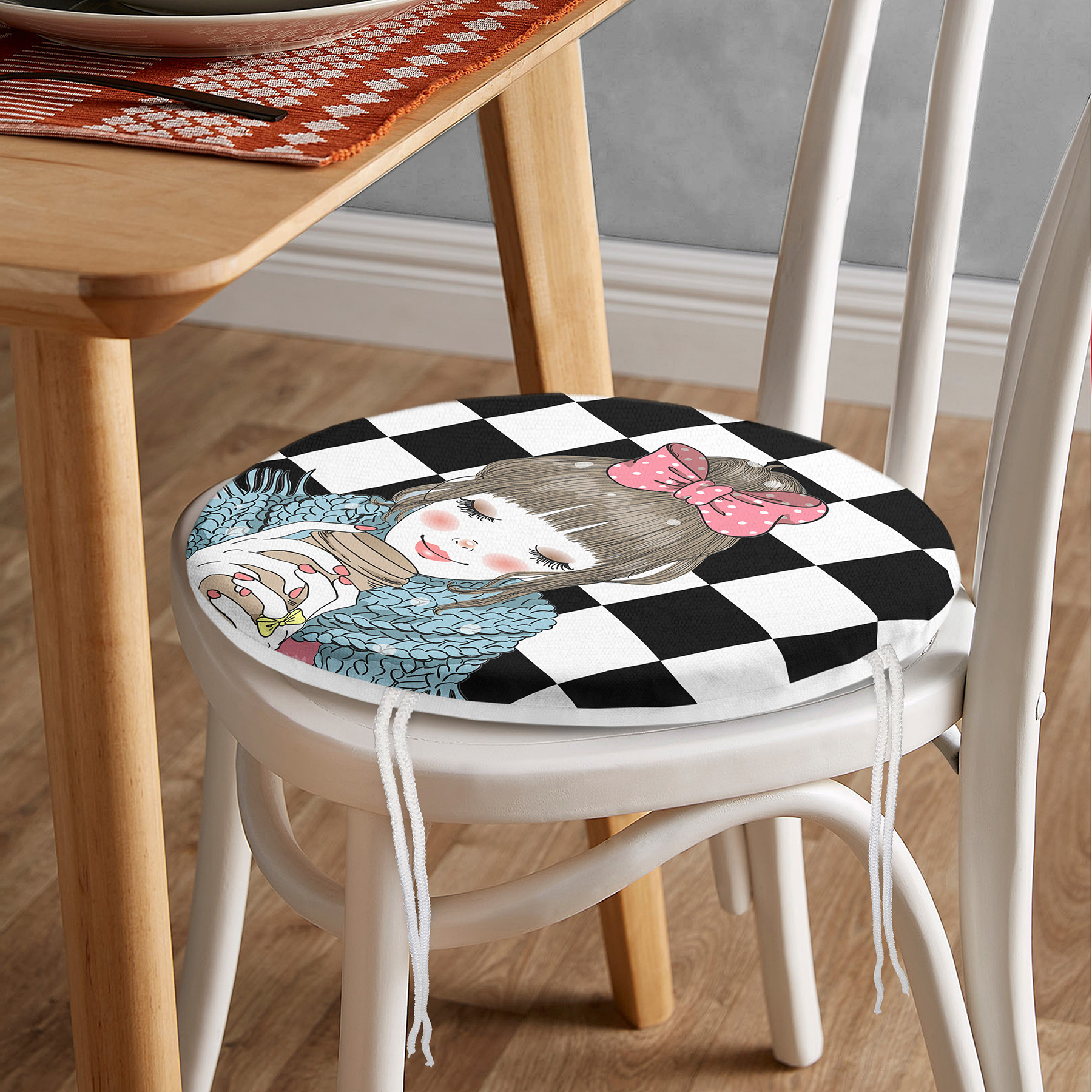 Dama Zeminli Kahve İçen Kız Motifli Dijital Baskılı Yuvarlak Fermuarlı Sandalye Minderi