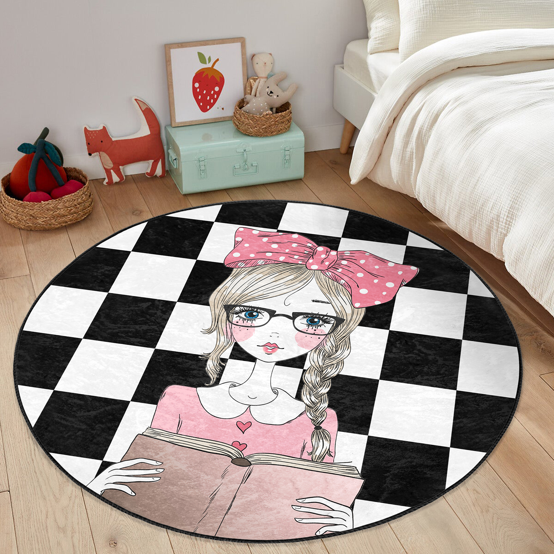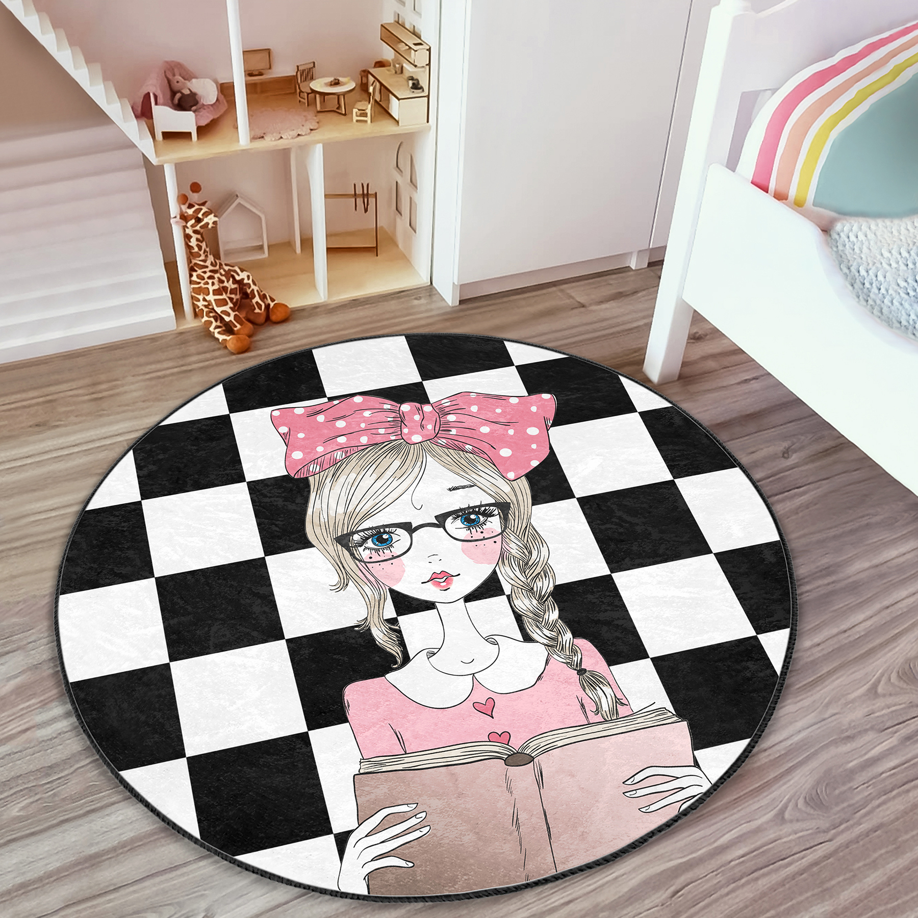 Dama Zeminli Kitap Okuyan Kız Tasarımlı Çocuk & Genç Odası Makinede Yıkanabilir Kaymaz Tabanlı Yuvarlak Çocuk Halısı