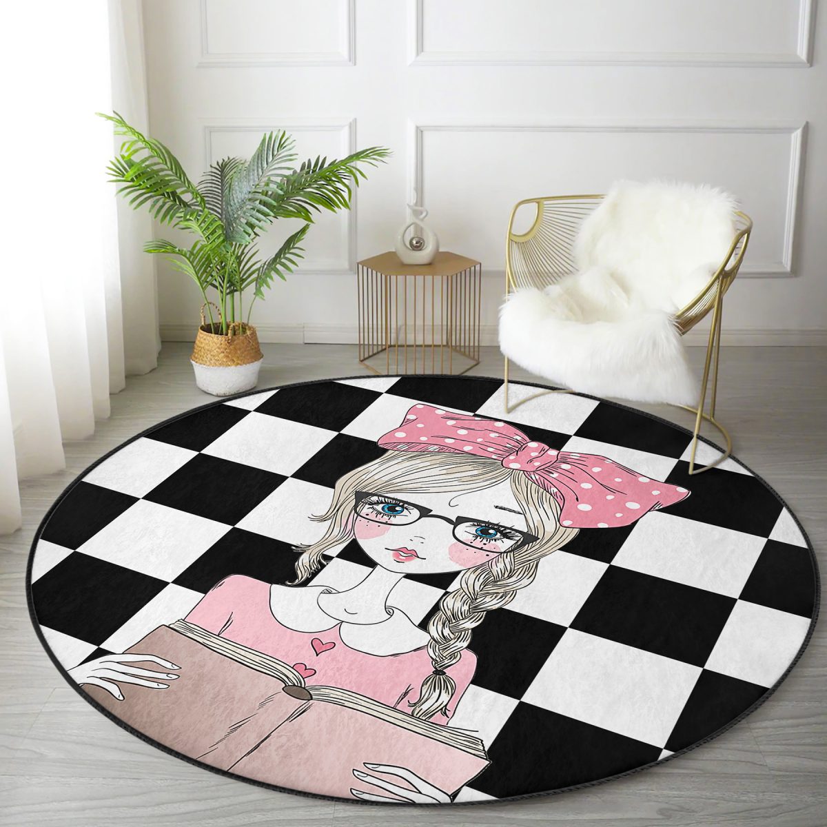 Dama Zeminli Kitap Okuyan Kız Tasarımlı Dijital Baskılı Modern Pembe Çocuk ve Genç Odası Yıkanabilir Kaymaz Tabanlı Yuvarlak Halı