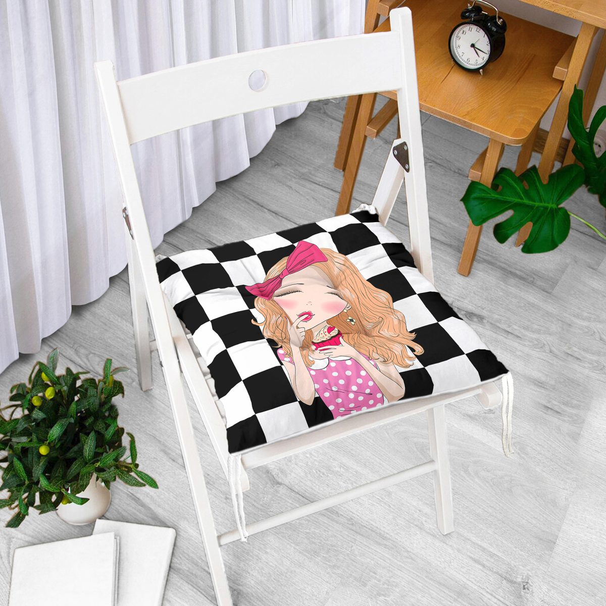 Dama Zeminli Pancakeli Kız Desenli Dijital Baskılı Modern Pofuduk Sandalye Minderi