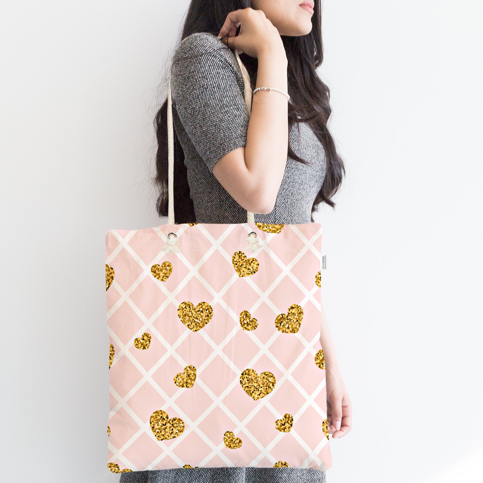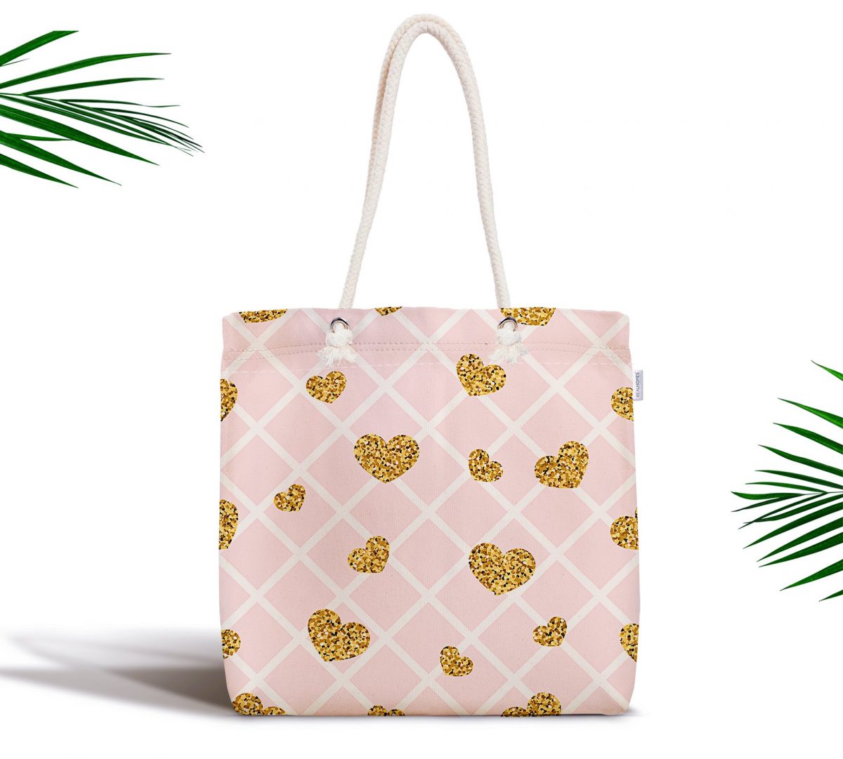 Damalı Pudra Renkli Altın Kalpler Özel Tasarım Fermuarlı Kumaş Çanta