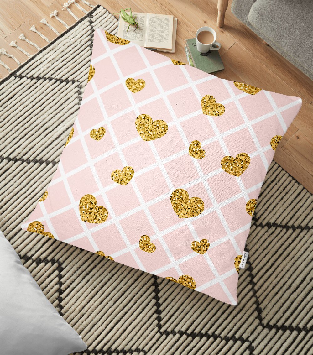 Damalı Pudra Renkli Altın Kalpler Özel Tasarım Yer Minderi – 70 x 70 cm