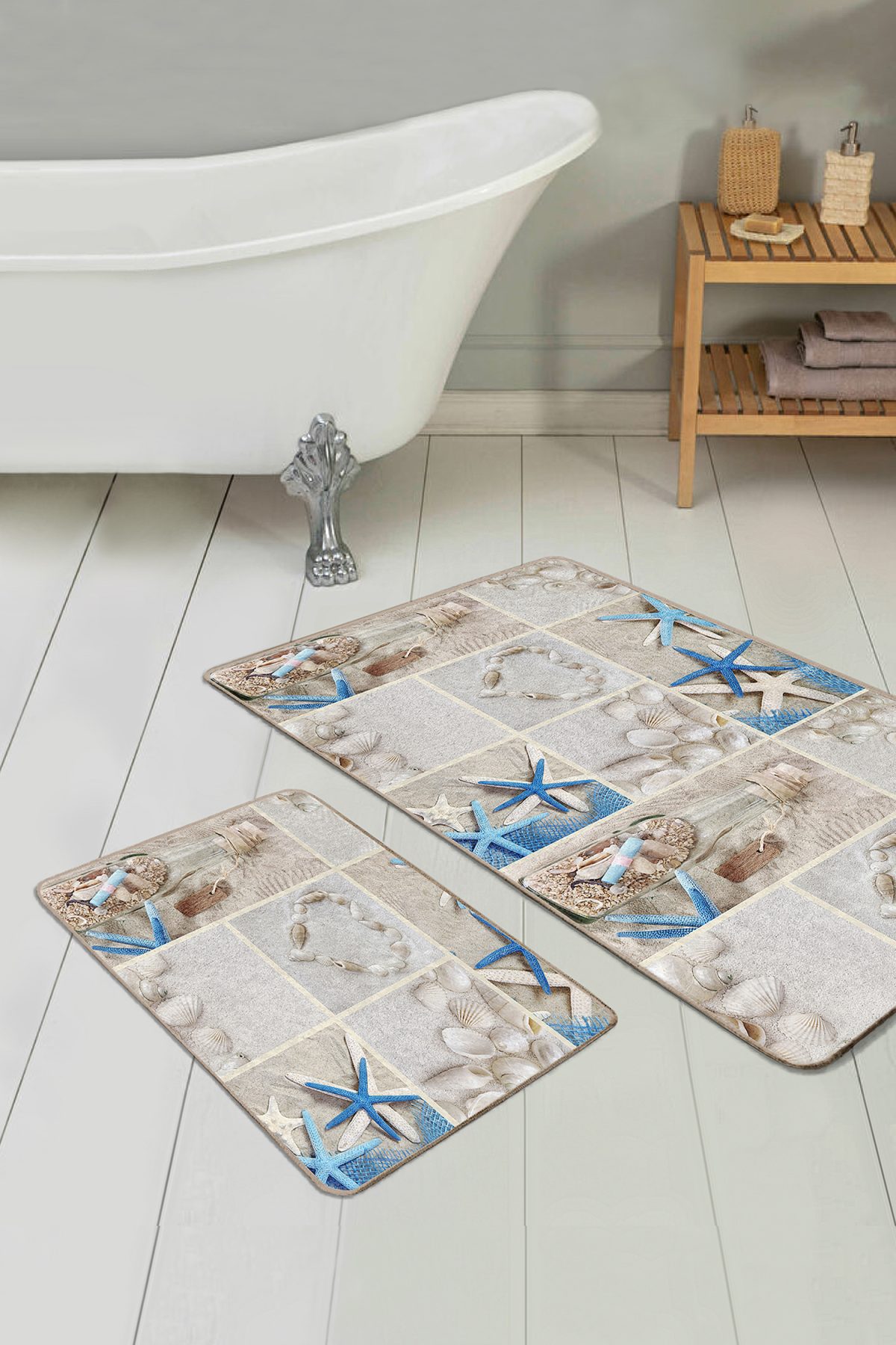 Deniz Kabuğu & Yıldızı Özel Tasarım 2’li Kaymaz Tabanlı Banyo & Mutfak Paspas Takımı