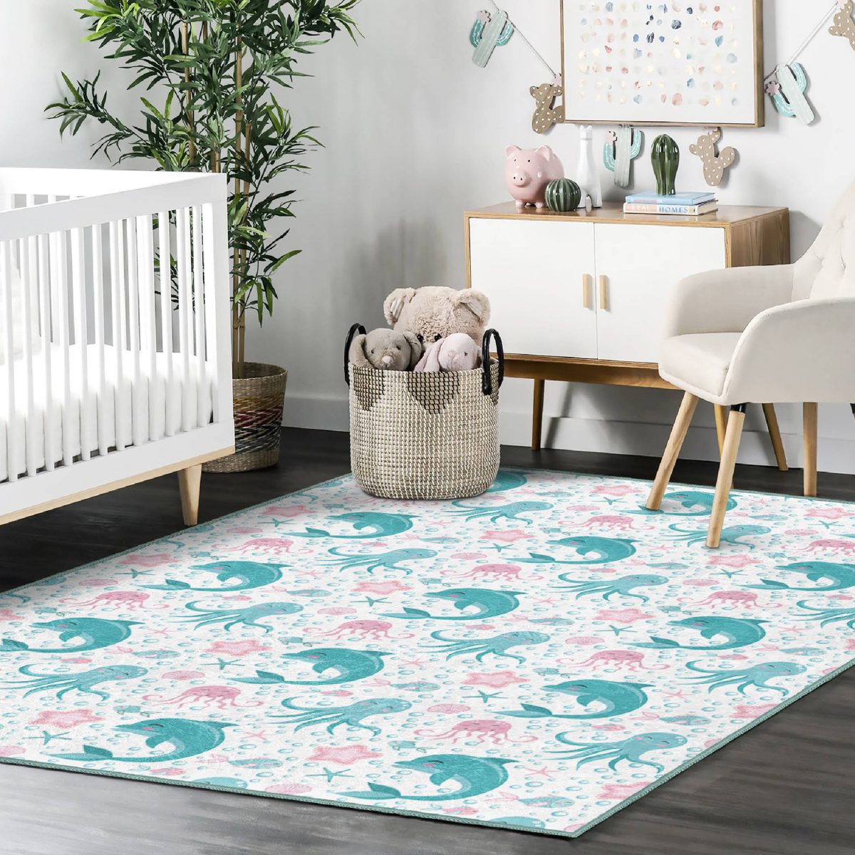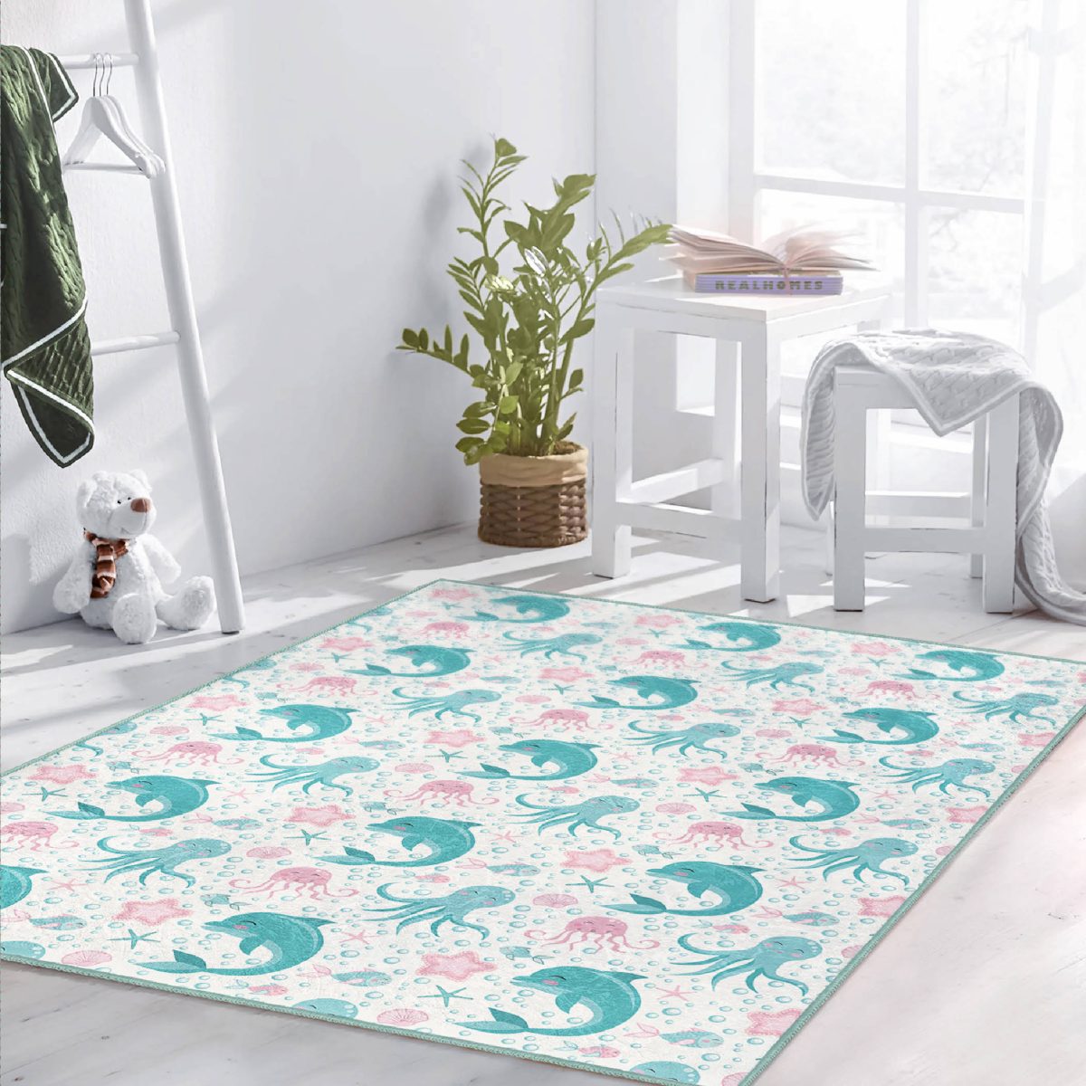 Deniz Motifli Gülen Yunus Tasarımlı Çocuk & Genç Odası Makinede Yıkanabilir Kaymaz Tabanlı Dekoratif Dikdörtgen Çocuk Halısı