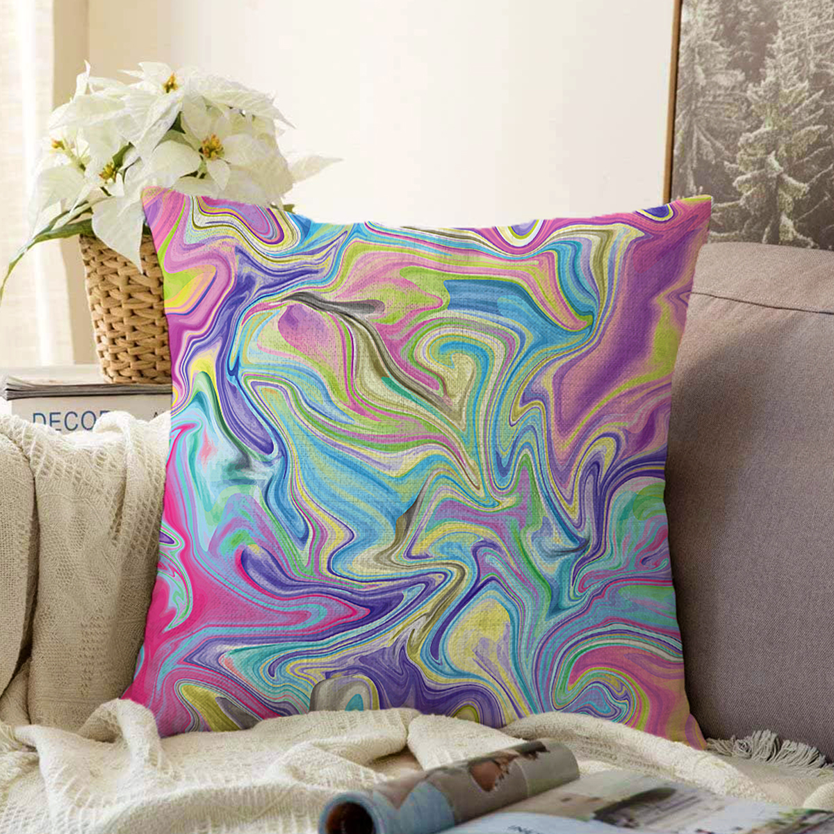 Ebru Desenli Dijital Baskılı Modern Şönil Yastık Kırlent Kılıfı