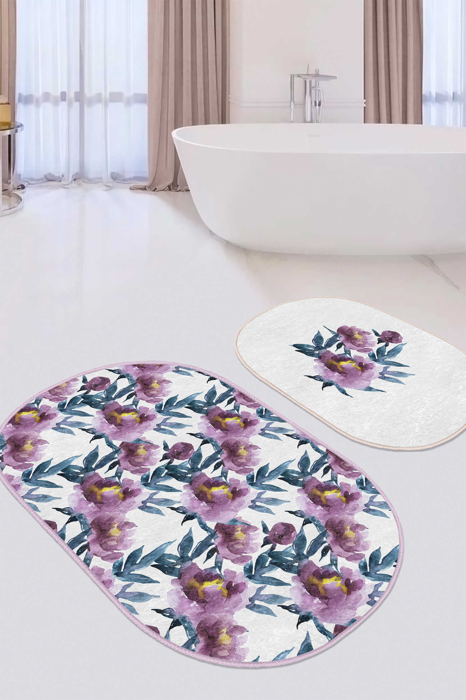 Eflatun Suluboya Gül Motifli 2’li Oval Kaymaz Tabanlı Banyo Paspası & Klozet Paspas Takımı