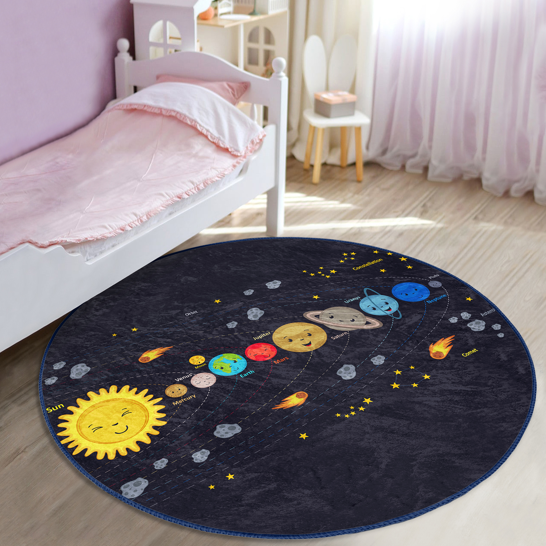 Eğitici Güneş Sistemi Tasarımlı Çocuk & Genç Odası Makinede Yıkanabilir Kaymaz Tabanlı Yuvarlak Çocuk Oyun Halısı