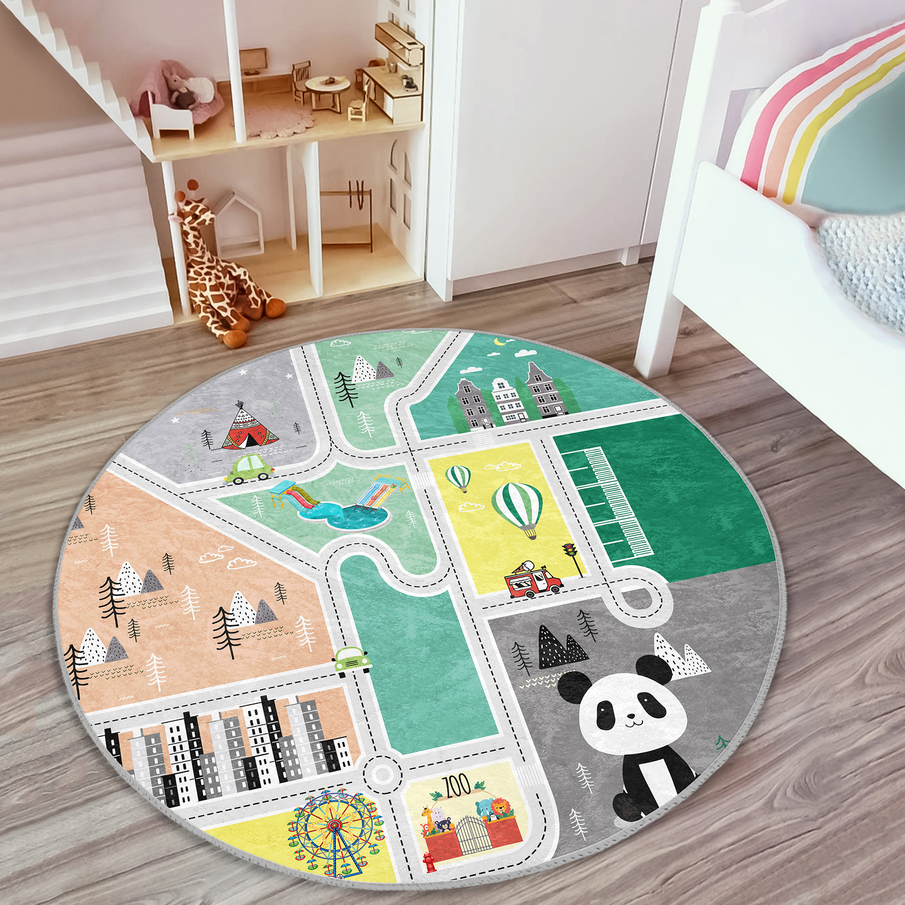 Eğitici Oyun Yolu Trafik Tasarımlı Çocuk & Genç Odası Makinede Yıkanabilir Kaymaz Tabanlı Yuvarlak Çocuk Oyun Halısı