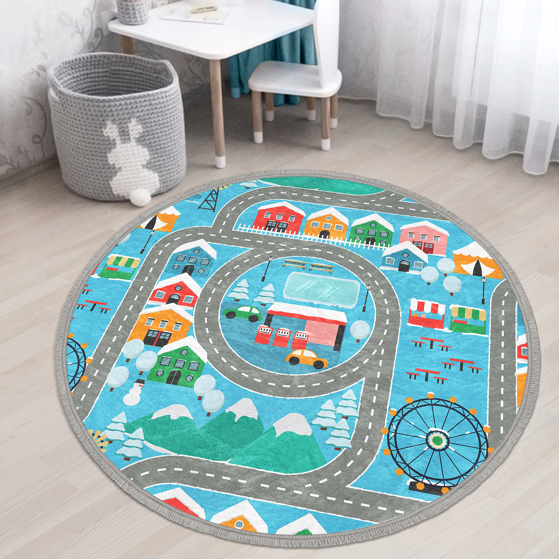 Eğitici Trafik Yolu Oyun Tasarımlı Çocuk & Genç Odası Makinede Yıkanabilir Kaymaz Tabanlı Püsküllü Yuvarlak Çocuk Oyun Halısı