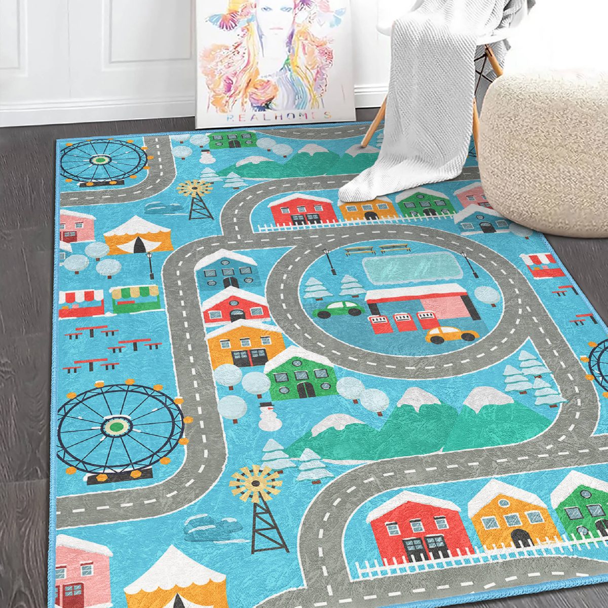 Renkli Mahalle Tasarımlı Oyun Yollu Çocuk & Genç Odası Makinede Yıkanabilir Kaymaz Tabanlı Yuvarlak Çocuk Oyun Halısı
