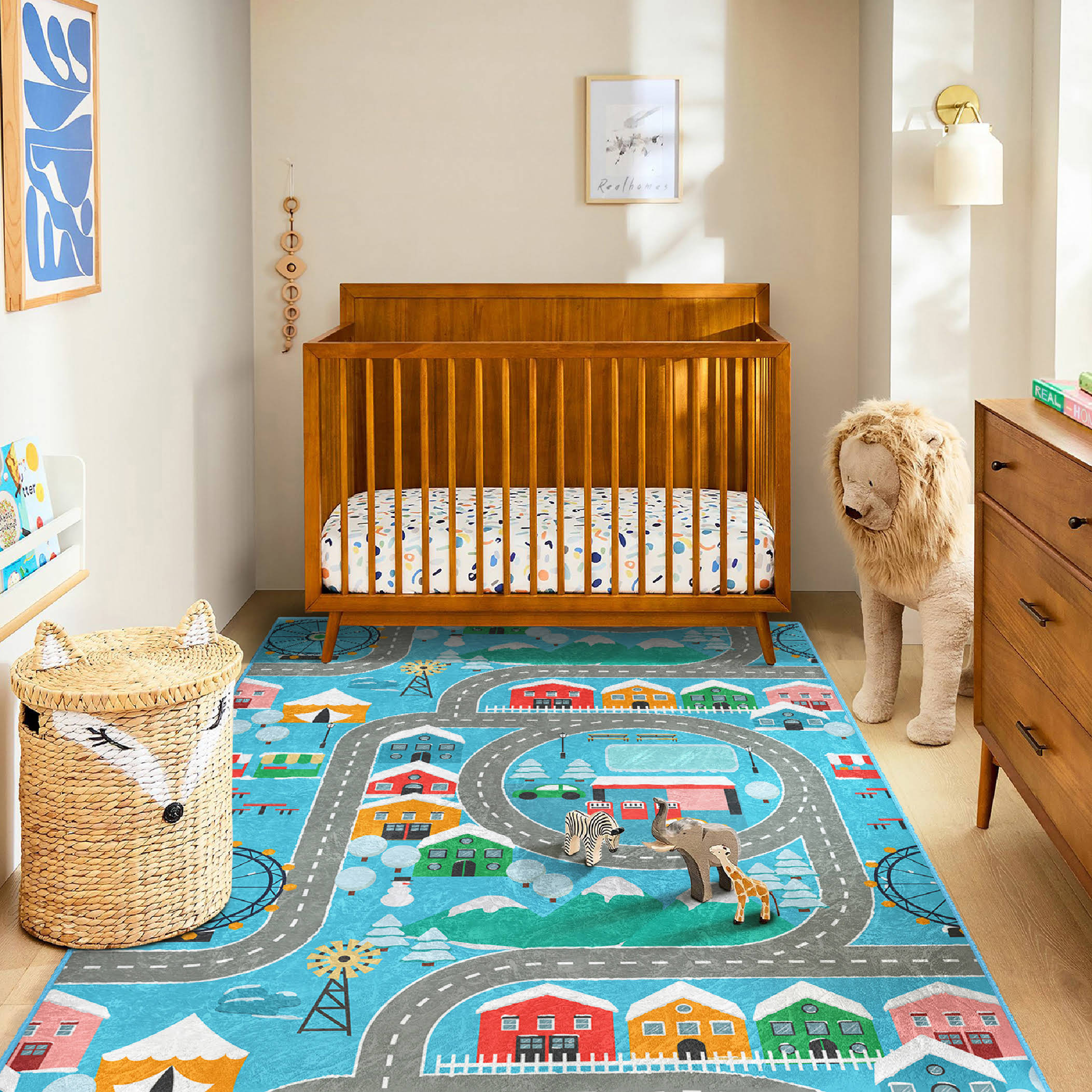 Renkli Hayvanlar Eğitici Yol Tasarımlı Çocuk & Genç Odası Makinede Yıkanabilir Kaymaz Tabanlı Yuvarlak Çocuk Oyun Halısı