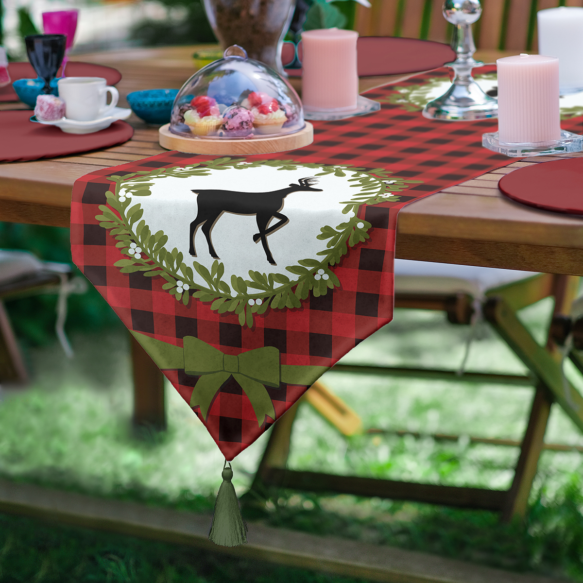 Ekose Zemin Çelenkli Geyik Motifli Dijital Baskılı Modern Püsküllü Şönil Üçgen Runner