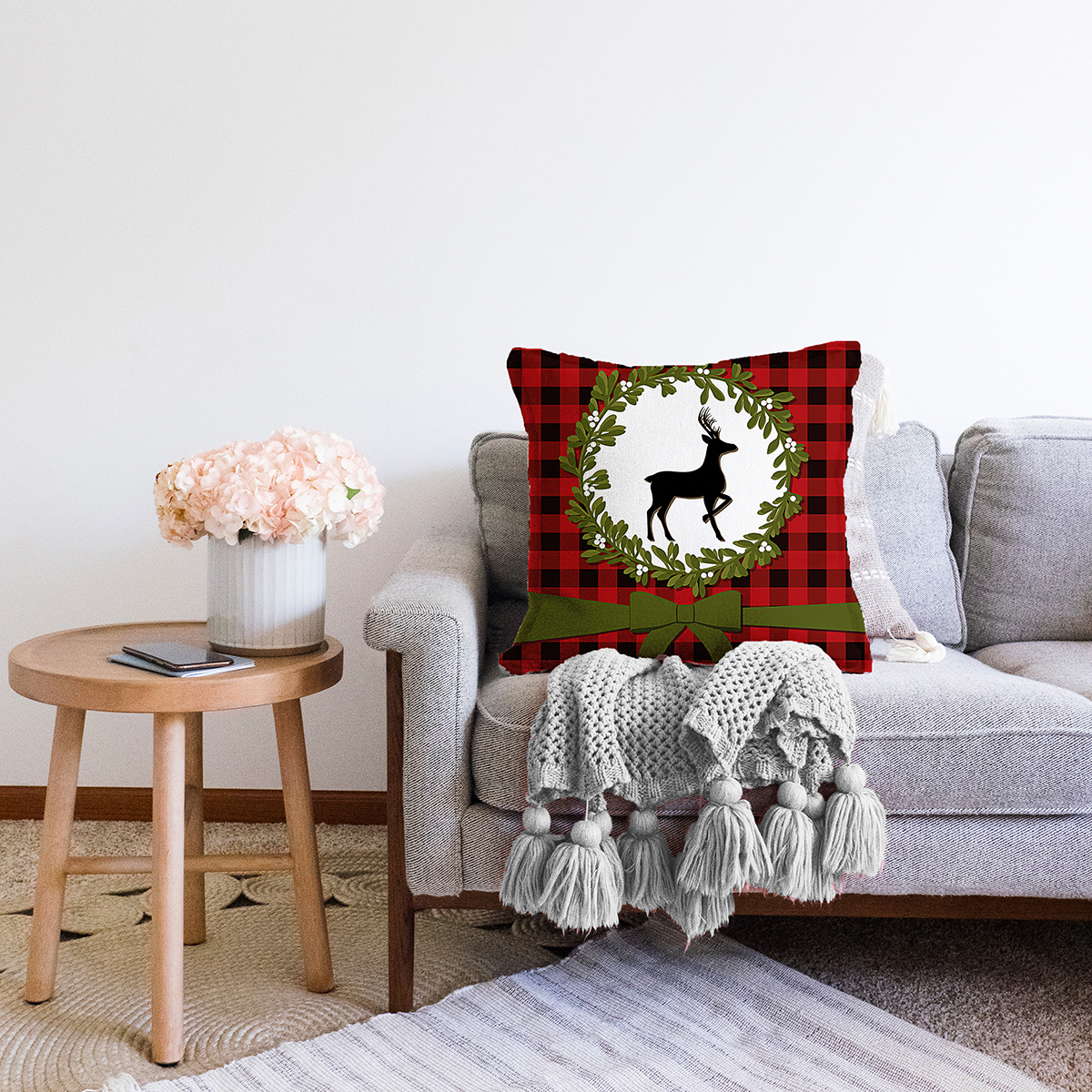 Ekose Zemin Çelenkli Geyik Motifli Dijital Baskılı Modern Raşel Kadife Yastık Kırlent Kılıfı