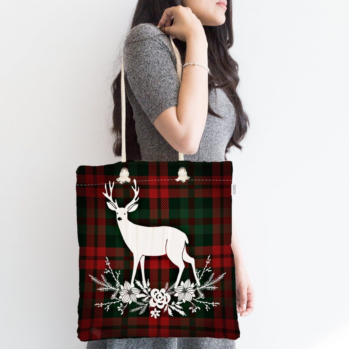 Ekose Zeminde Yılbaşı Geyik Temalı Dijital Baskılı Fermuarlı Kumaş Çanta