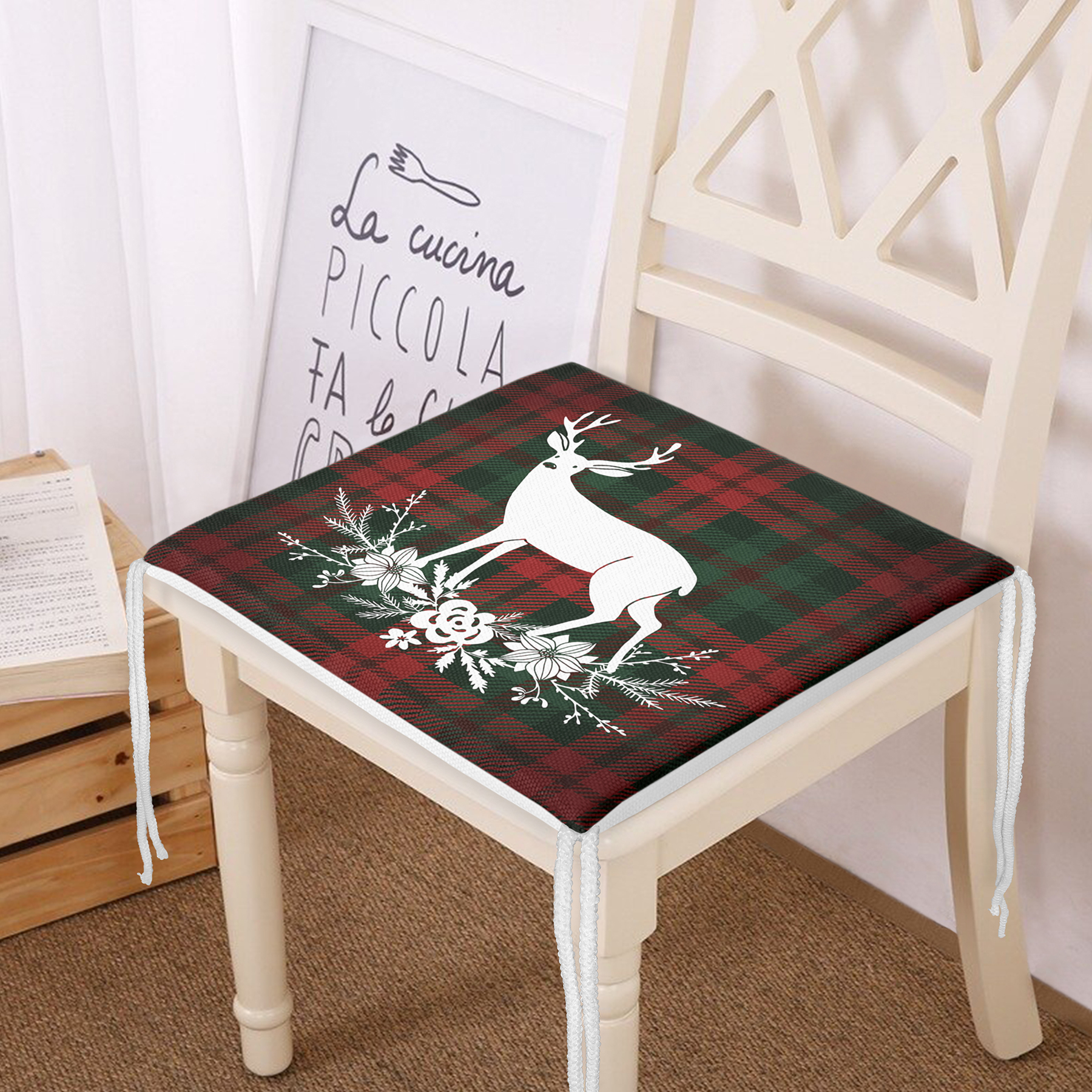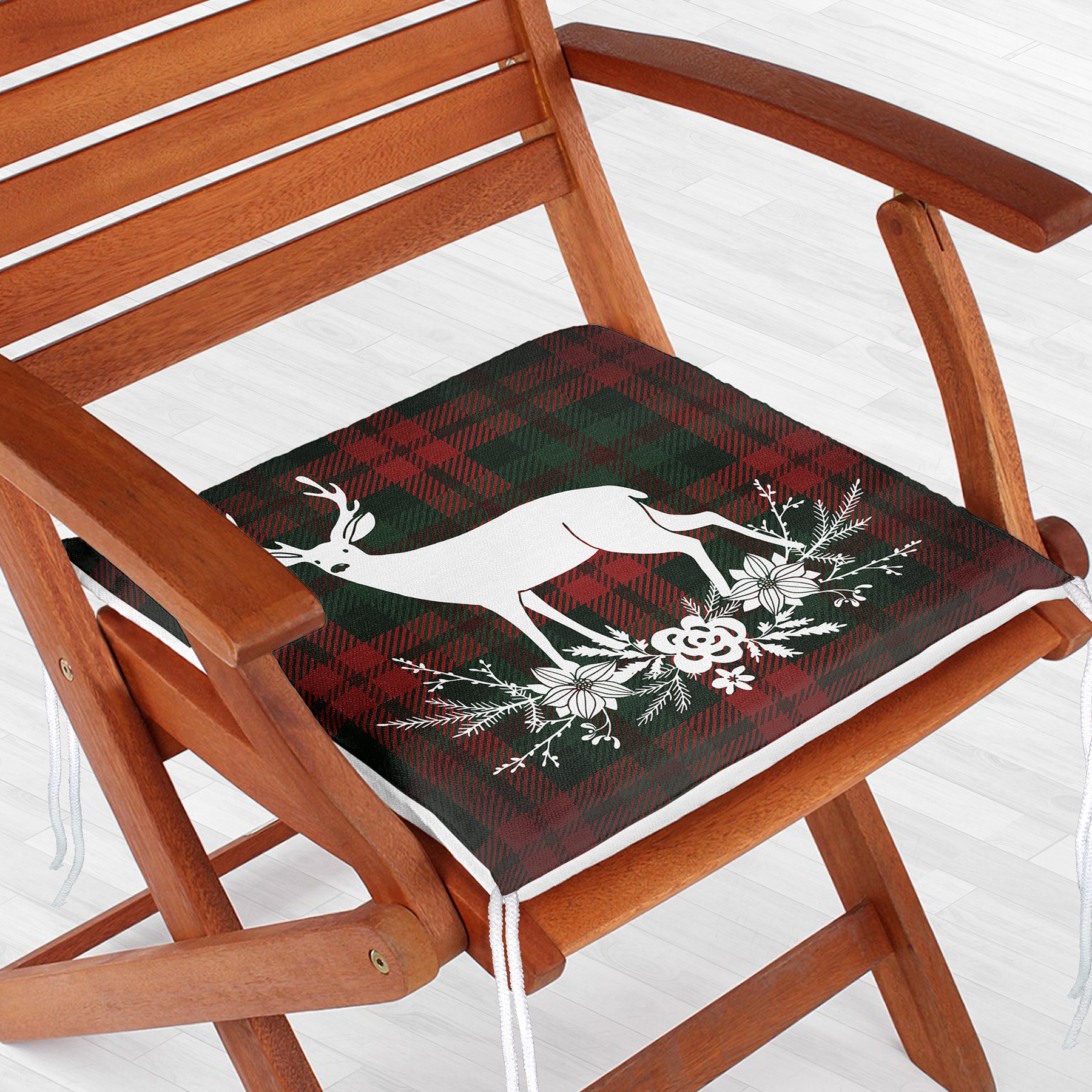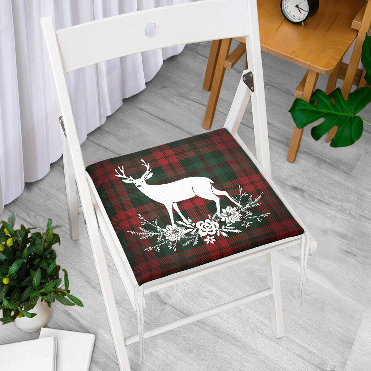 Ekose Zeminde Yılbaşı Geyik Temalı Dijital Baskılı Fermuarlı Sandalye Minderi