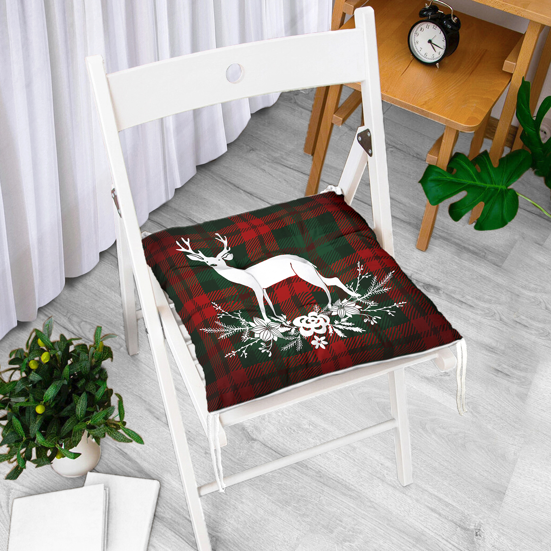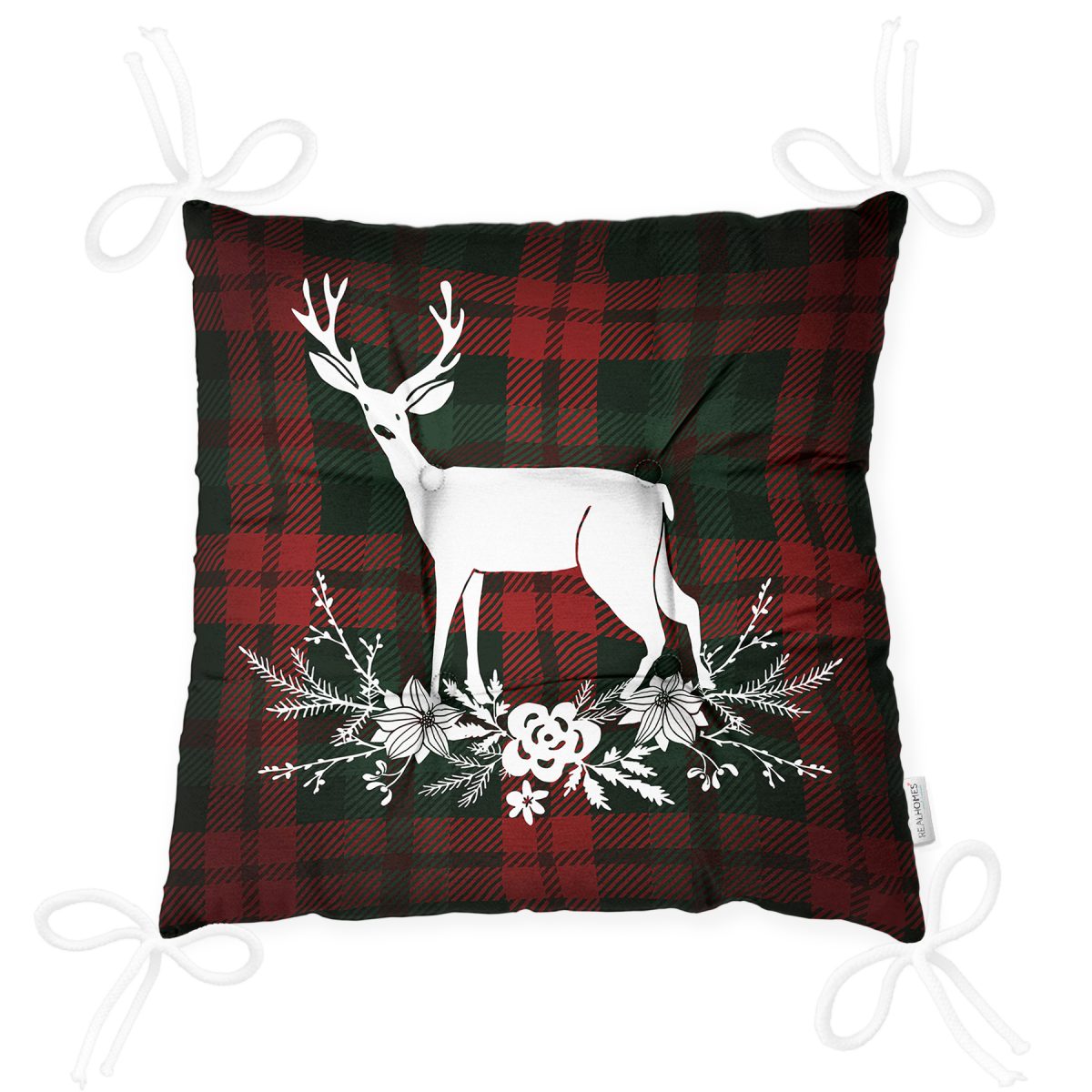 Ekose Zeminde Yılbaşı Geyik Temalı Dijital Baskılı Pofuduk Sandalye Minderi Realhomes