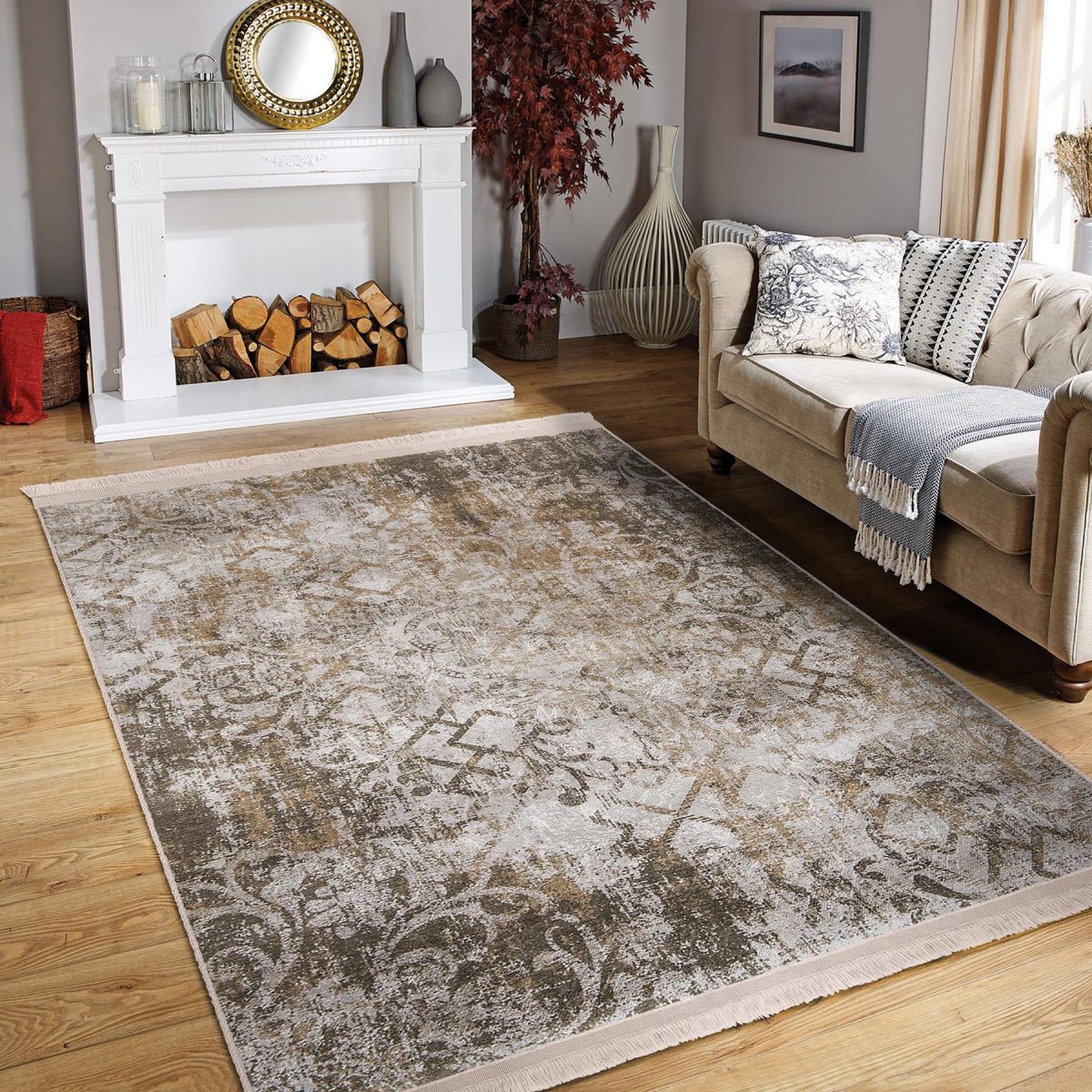 Gri Zeminde Damask Motifli Kilim Desenli Eskitme Motifli Etnik Motifler Salon & Oturma Odası Koridor & Antre Dijital Baskılı Makinede Yıkanabilir Kaymaz Taban Saçaklı Halı