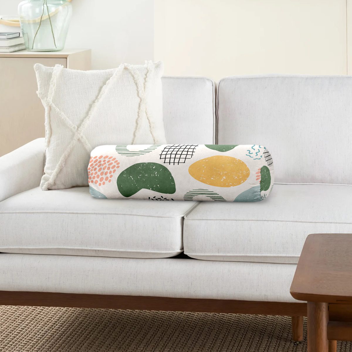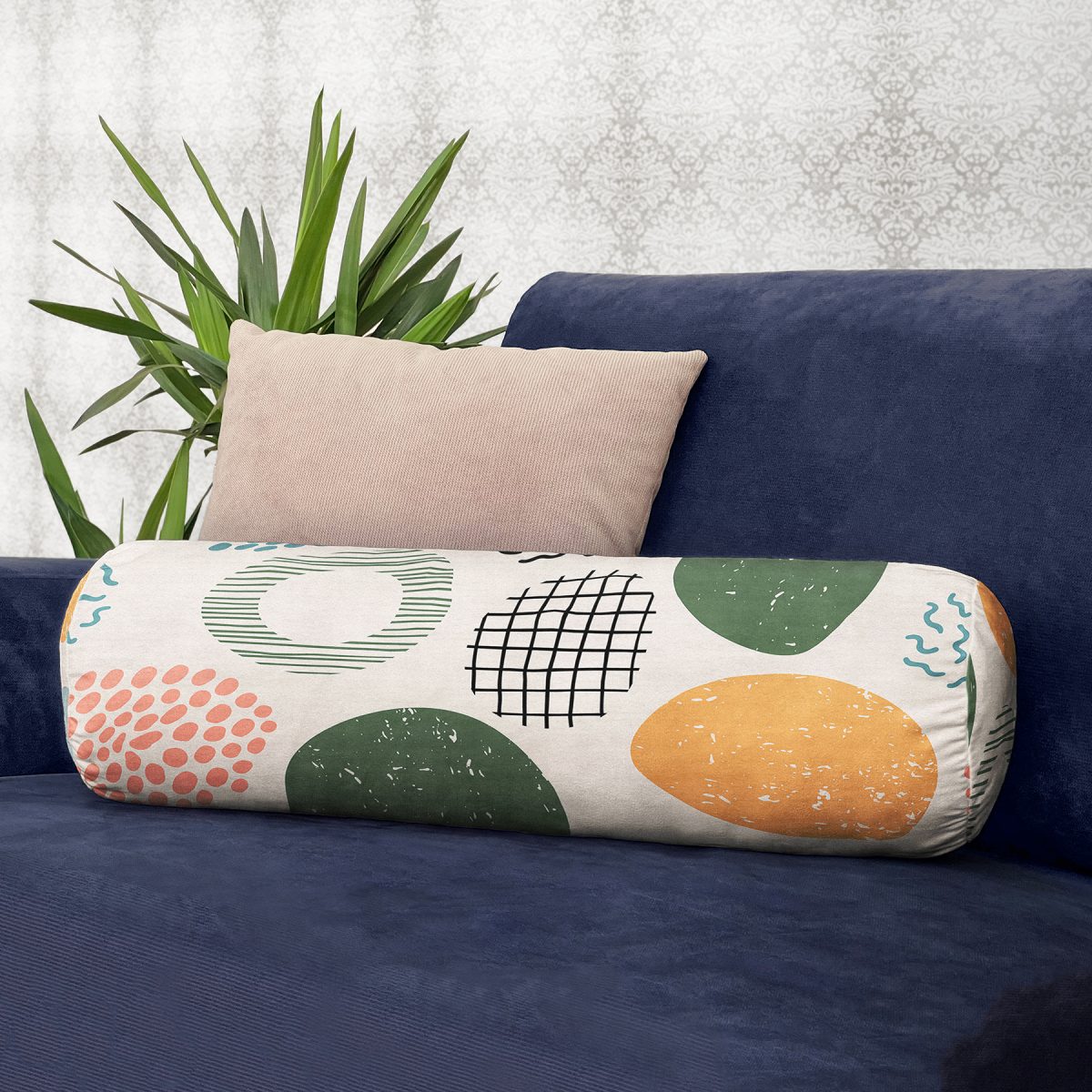 Ekru Zeminde Geometrik Zeminler Dijital Baskılı Modern İç Dolgulu Süet Silindir Yastık Kırlent – Bel Yastığı