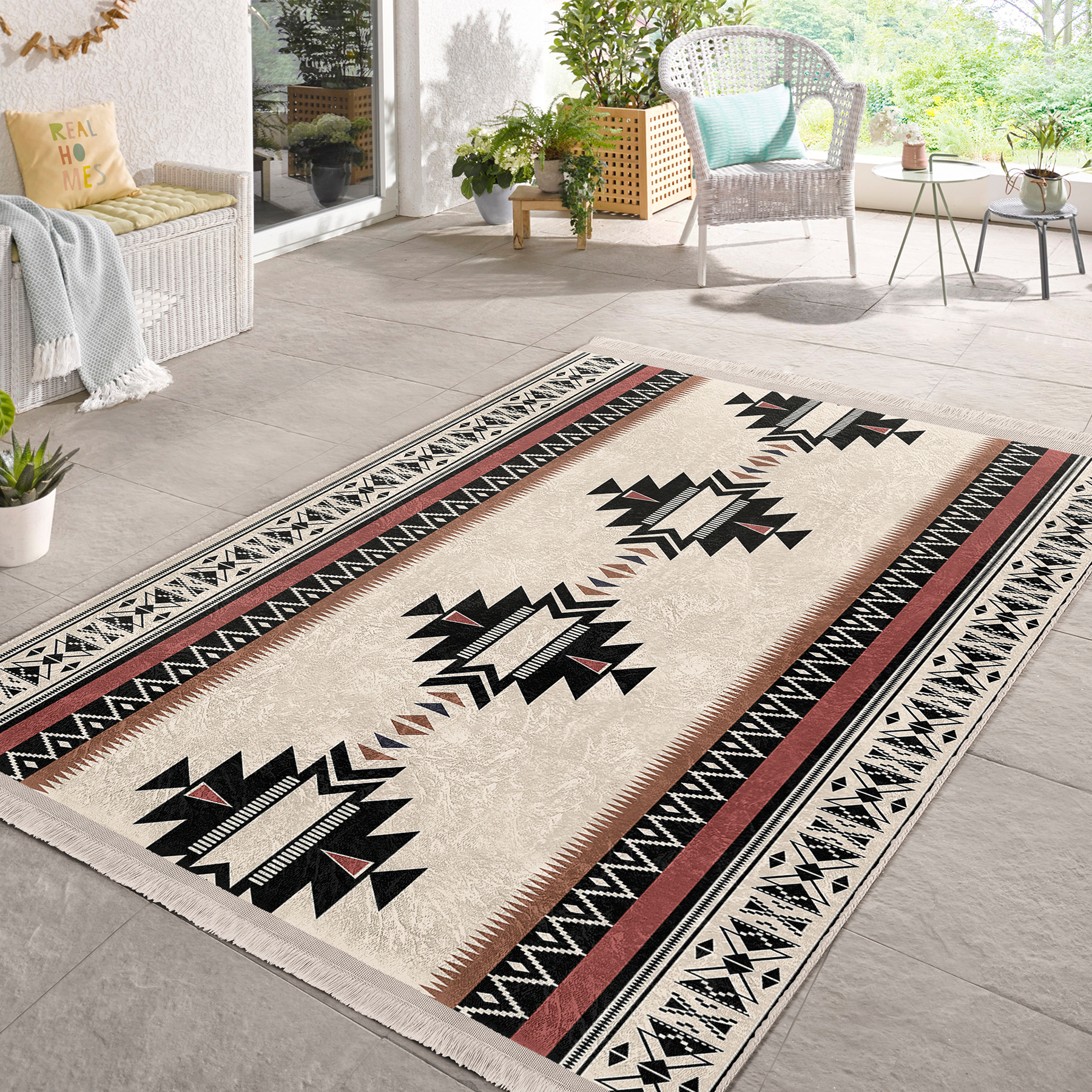 Bej Zeminde Kilim Motifli Geleneksel Desenli Avangarde Etnik Motifler Salon & Oturma Odası Koridor & Antre Dijital Baskılı Makinede Yıkanabilir Kaymaz Taban Saçaklı Halı