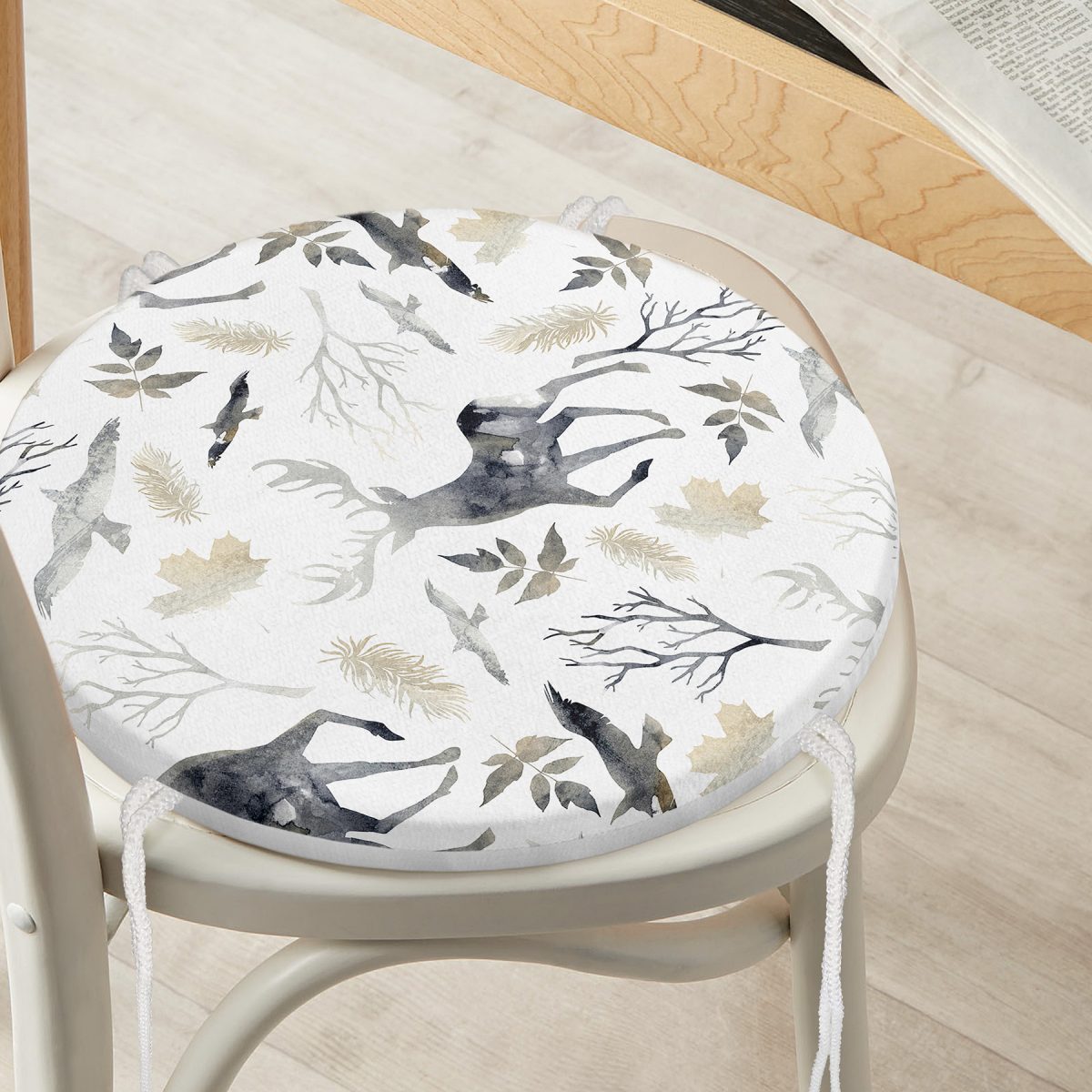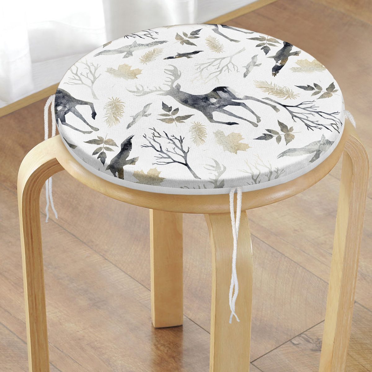 Ekru Zeminli Geyik ve Yaprak Motifler Dijital Baskılı Yuvarlak Fermuarlı Sandalye Minderi