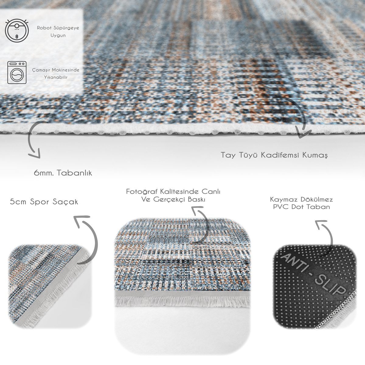 Tabanlık ve Dolgu: 5 mm Kaymaz dokuma tabanlıdır.