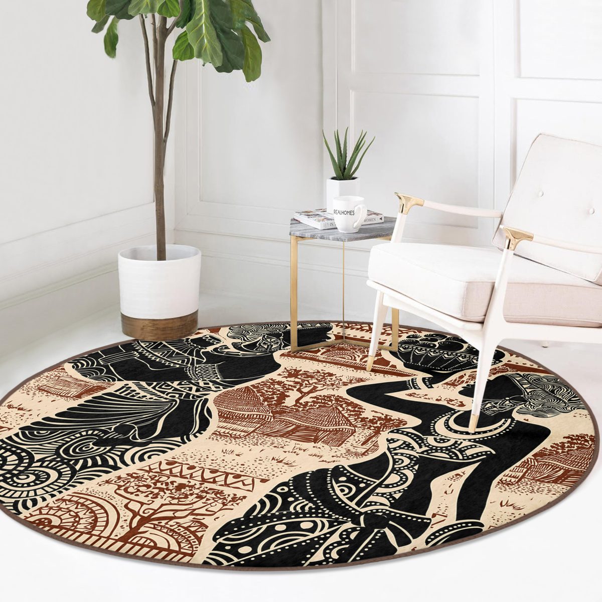 Etnik Desen Zeminli Afrika Kadın Motifli Kahverengi Outdoor Yıkanabilir Kaymaz Tabanlı Yuvarlak Halı