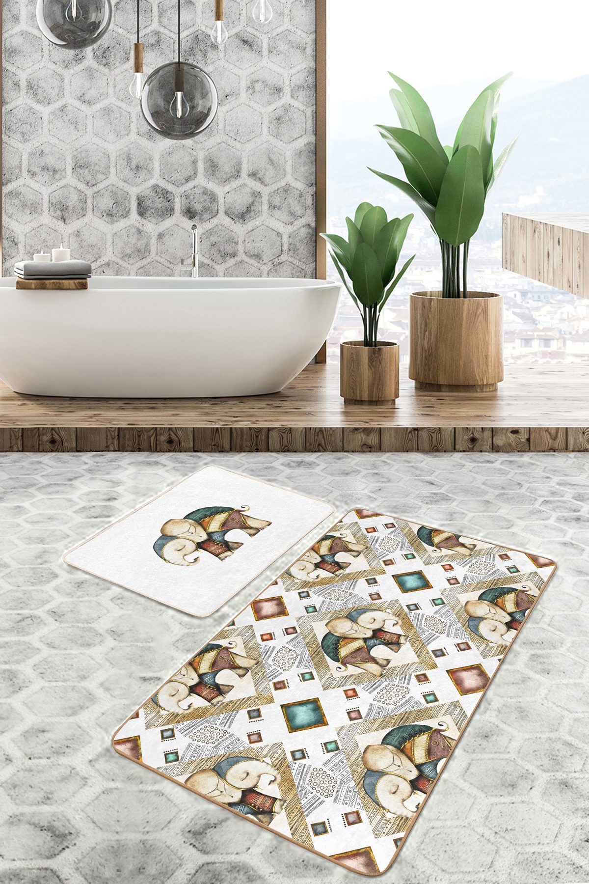 Etnik Fil Figürlü 2’li Mutfak Paspas Seti & Banyo Halı Takımı