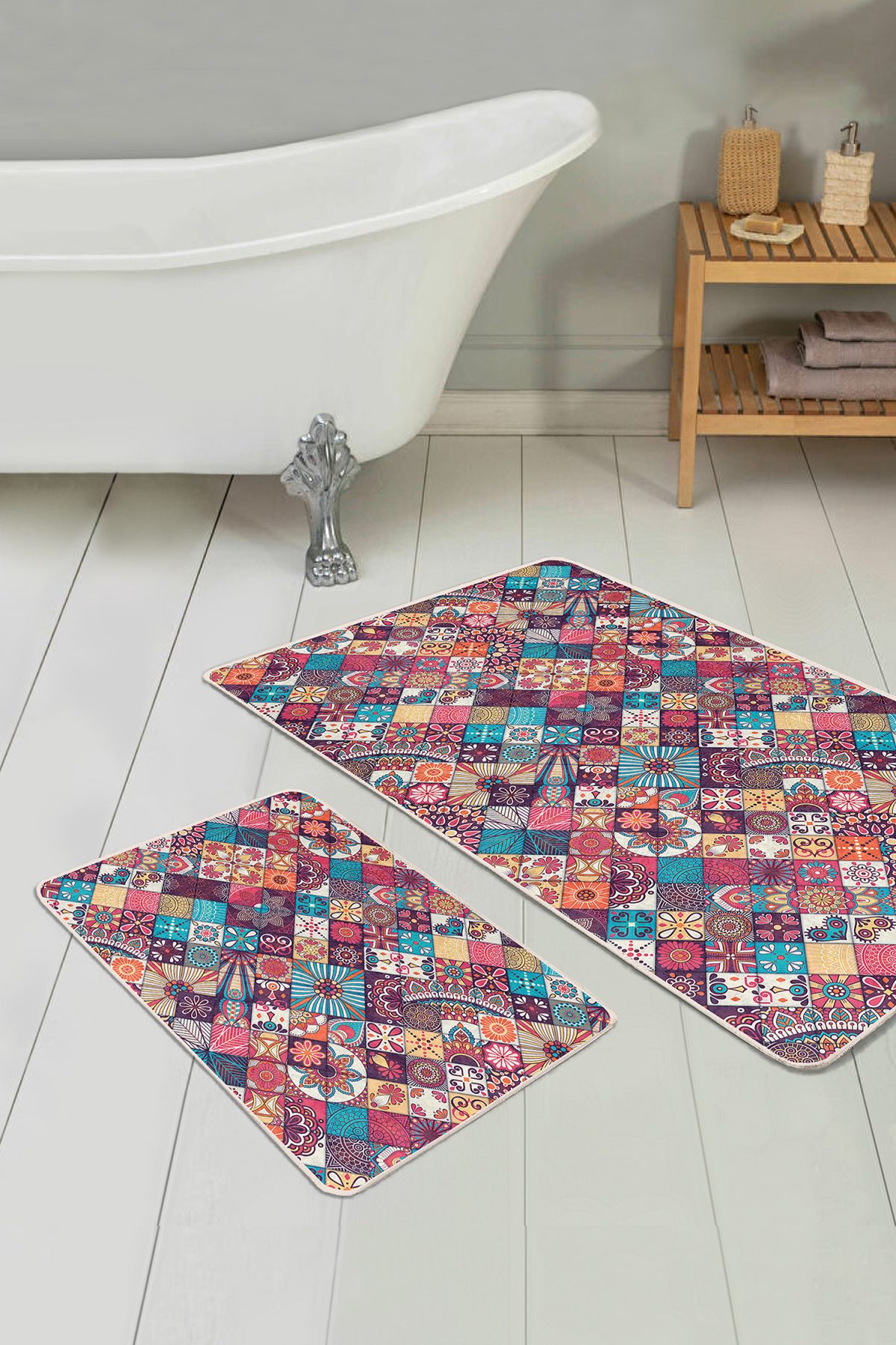 Etnik Kareli Tasarımlı Dijital Baskılı 2’li Kaymaz Tabanlı Banyo & Mutfak Paspas Takımı
