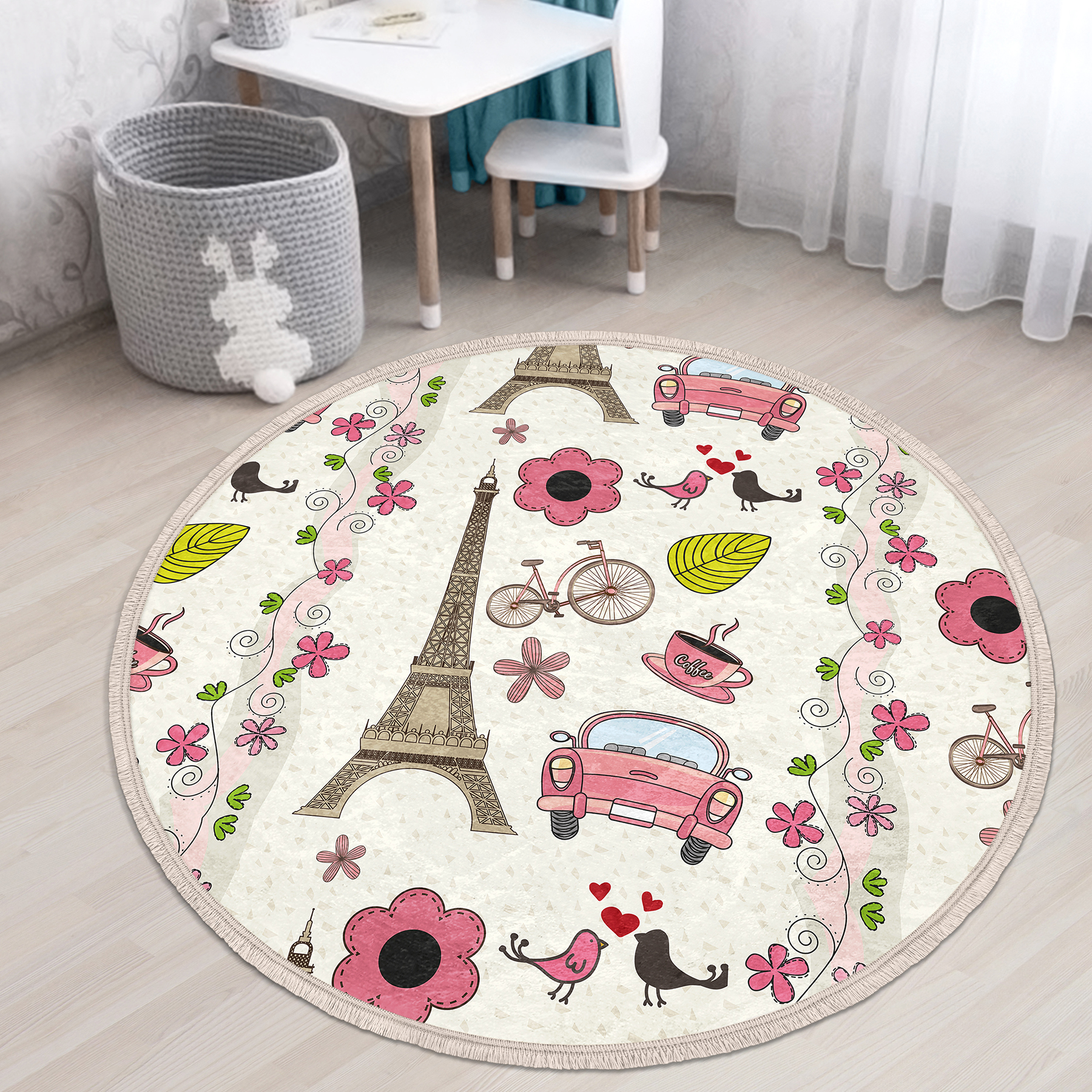 Eyfel Kulesi Desenli Vintage Çocuk & Genç Odası Makinede Yıkanabilir Kaymaz Tabanlı Püsküllü Yuvarlak Kadife Halı