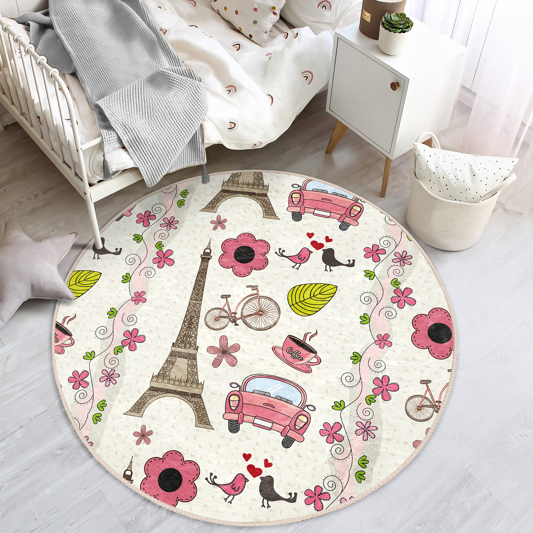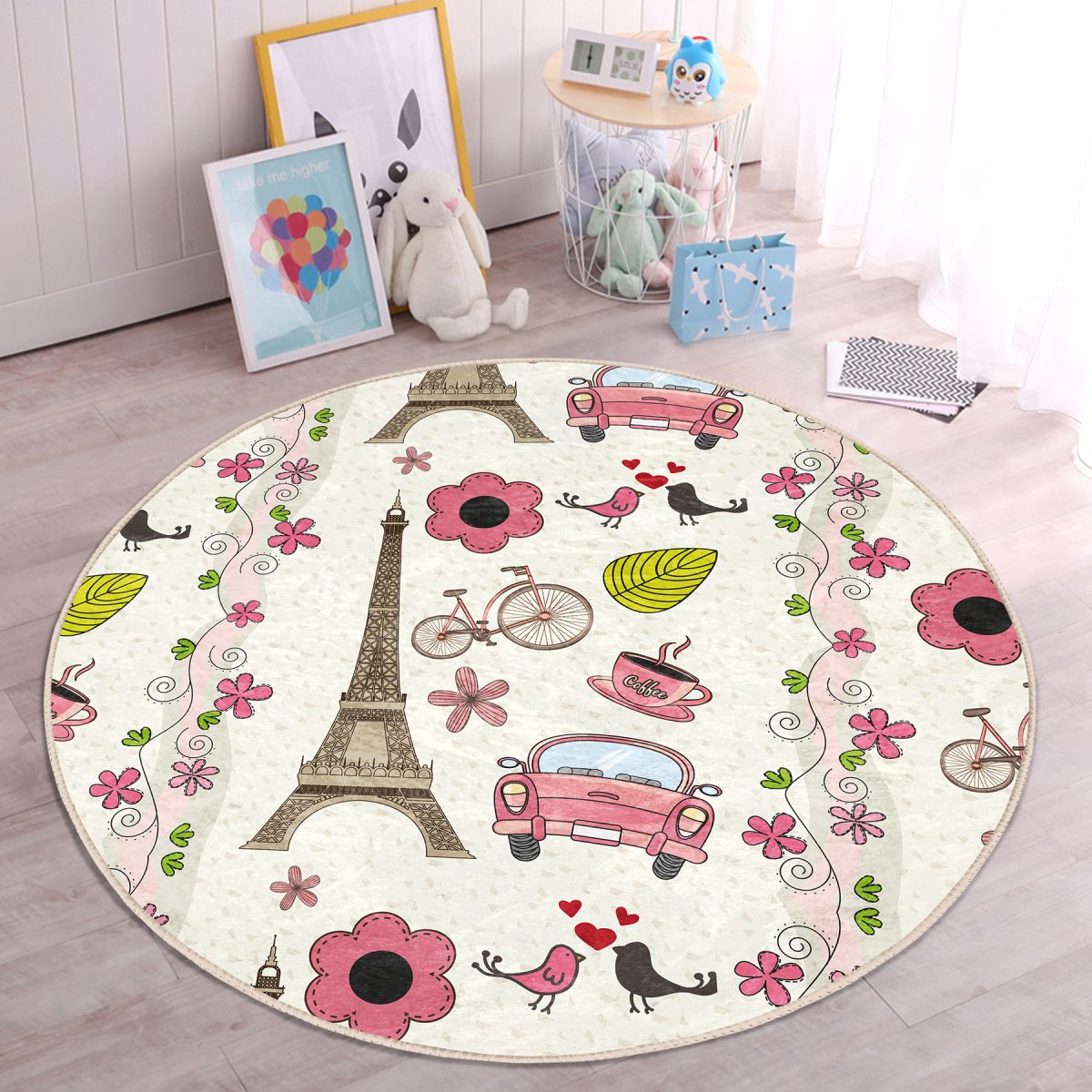 Eyfel Kulesi Desenli Vintage Çocuk & Genç Odası Makinede Yıkanabilir Kaymaz Tabanlı Yuvarlak Kadife Halı