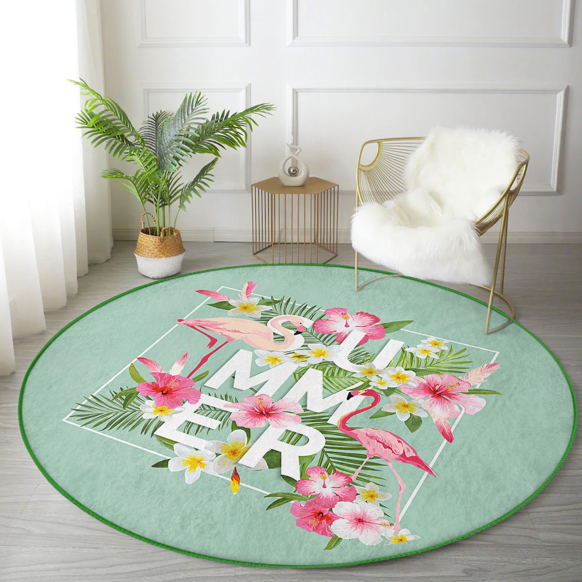 Flamingo Desen Dijital Baskılı Modern Yeşil Salon ve Oturma Odası Yıkanabilir Kaymaz Tabanlı Yuvarlak Halı