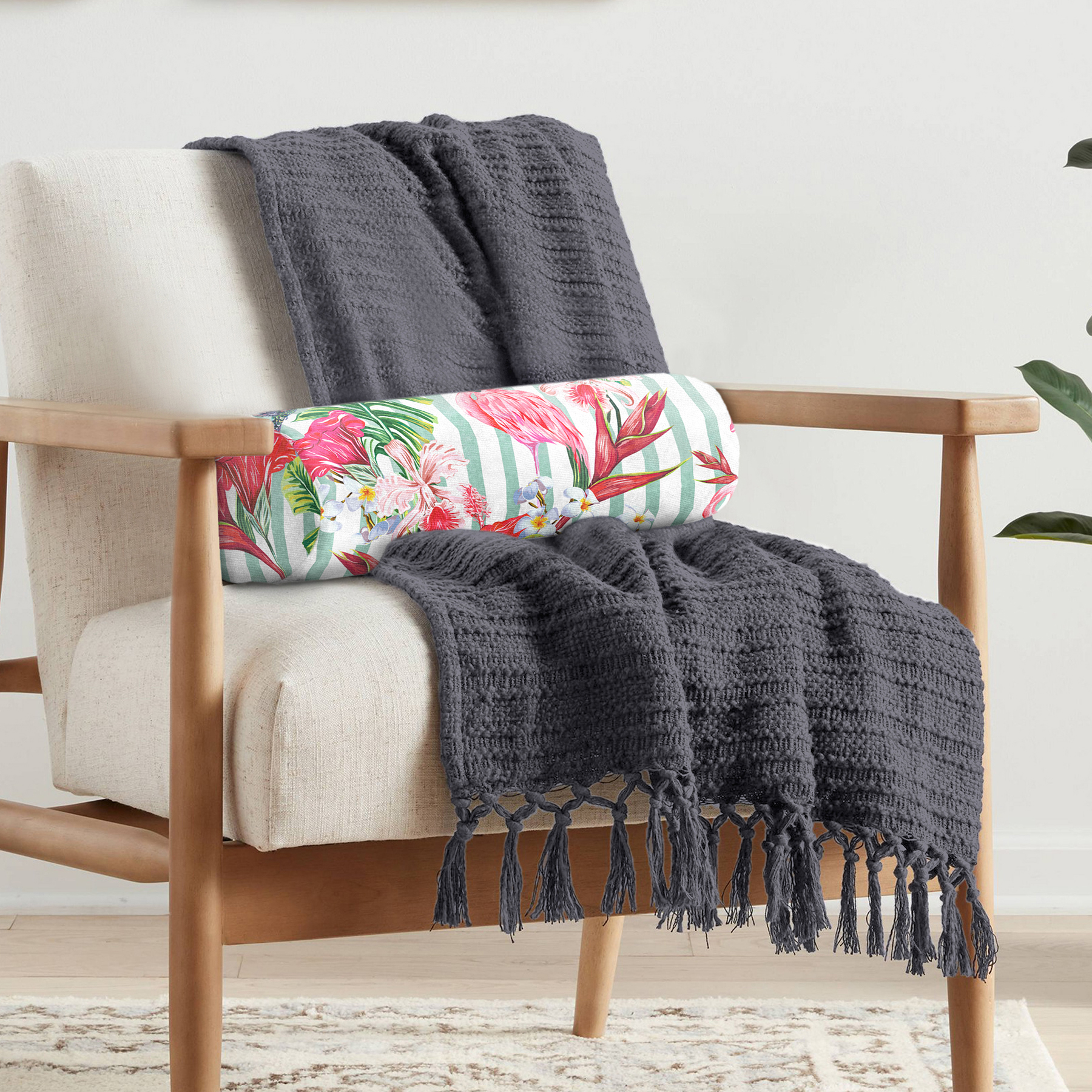 Flamingo Motifli Şerit Desenli Dekoratif İç Dolgulu Fermuarlı Çok Amaçlı Silindir Yastık Kırlent