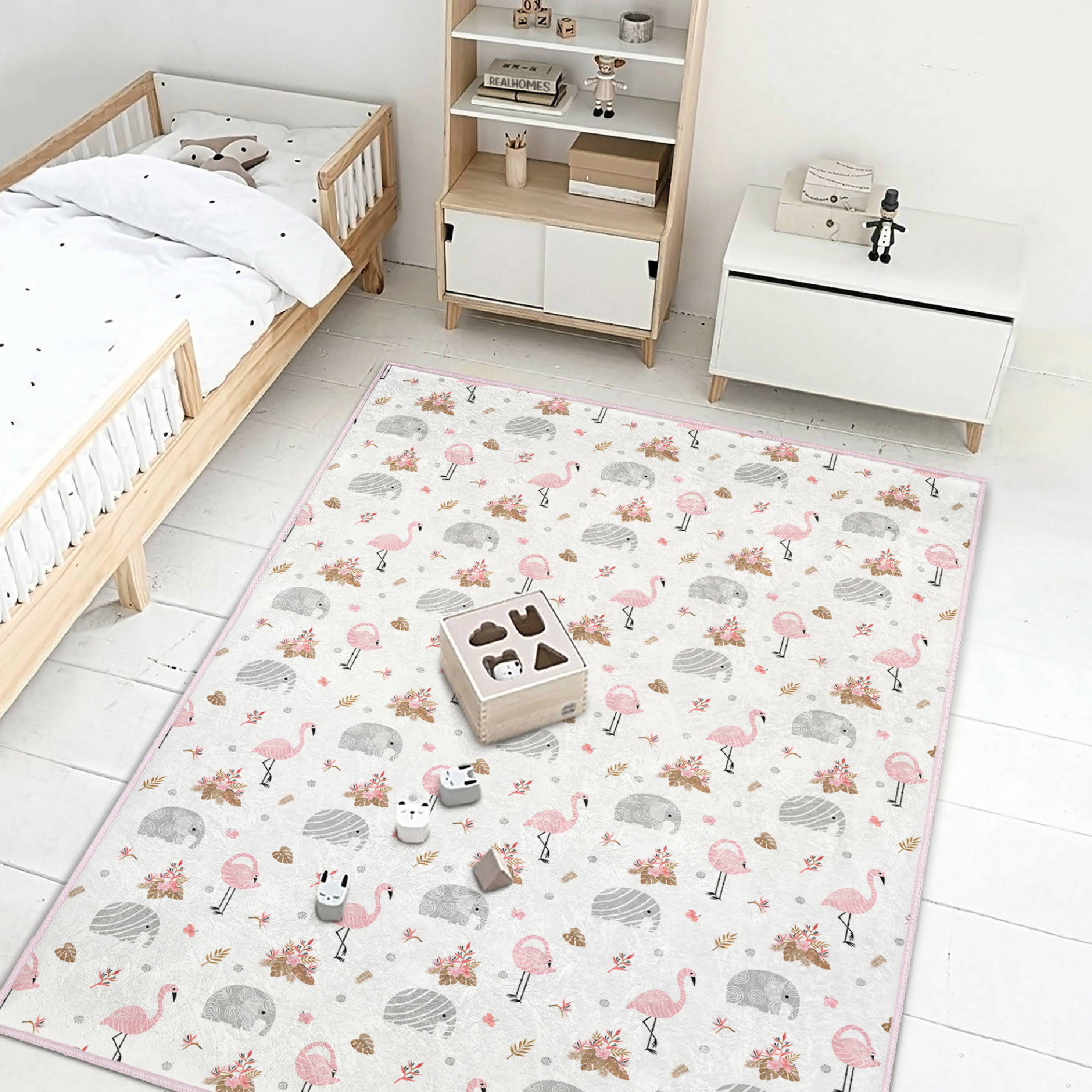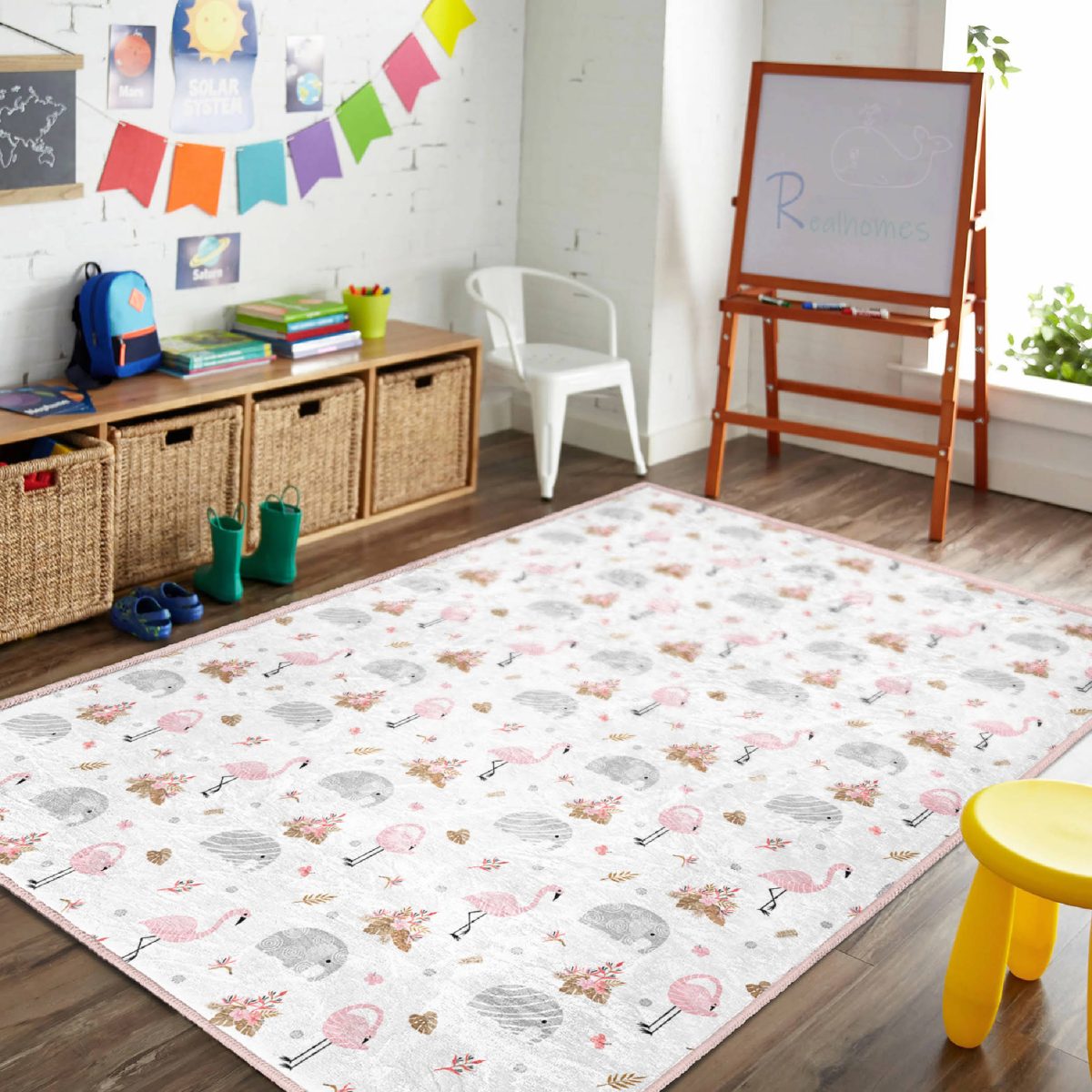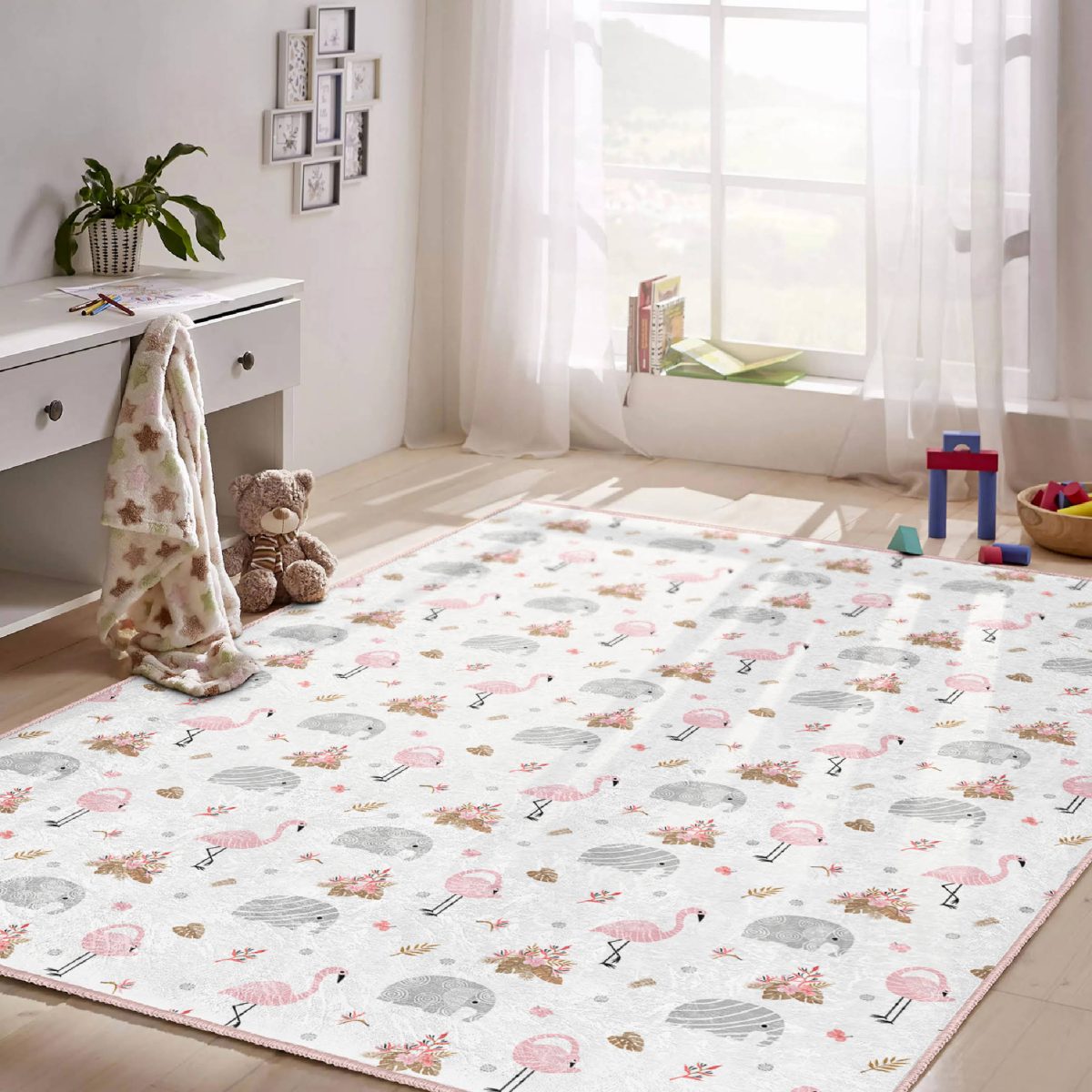 Flamingo Ve Fil Motifli Çocuk & Genç Odası Makinede Yıkanabilir Dekoratif Kaymaz Tabanlı Dikdörtgen Pamuk Tabanlı Çocuk Halısı